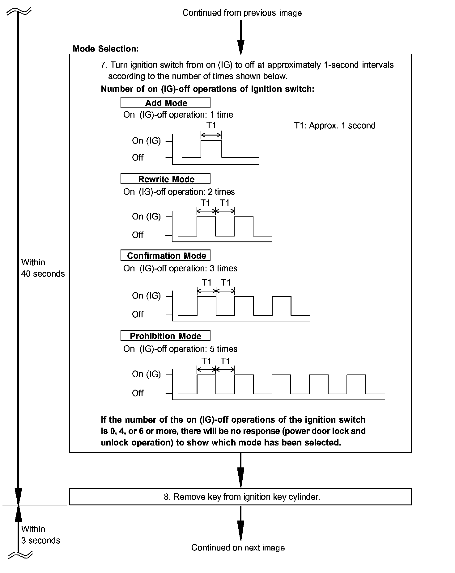 - Add mode is used to register new recognition codes while still retaining codes already registered. This mode is used when a new transmitter is added. If the number of registered codes exceeds 4, the previously registered codes will be erased in order, starting from the oldest registered code.