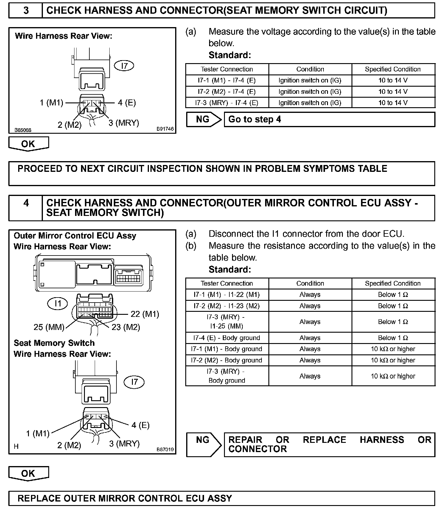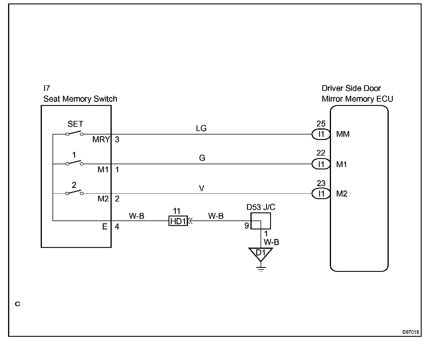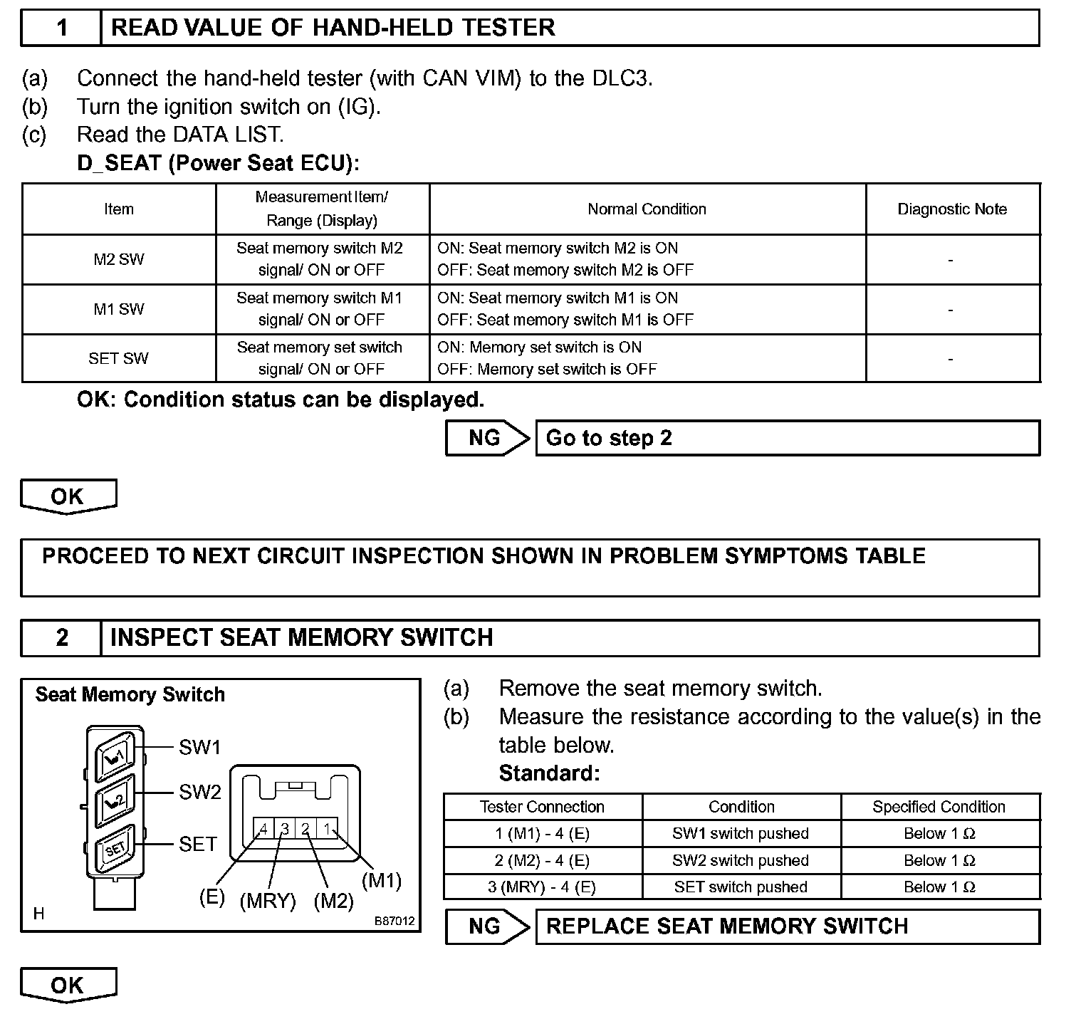 The seat memory switch sends signals to the outer mirror control ECU assembly via the multiplex communication system to memorize a given seat position. This memory system does not use a position sensor. The seat position is detected by counting pulses that are output when the motor turns. If there is no pulse output from the motor, the motor will stop operating. The seat memory switch is later used to send signals to the front power seat switch to return the seat to one of the memorized positions.
