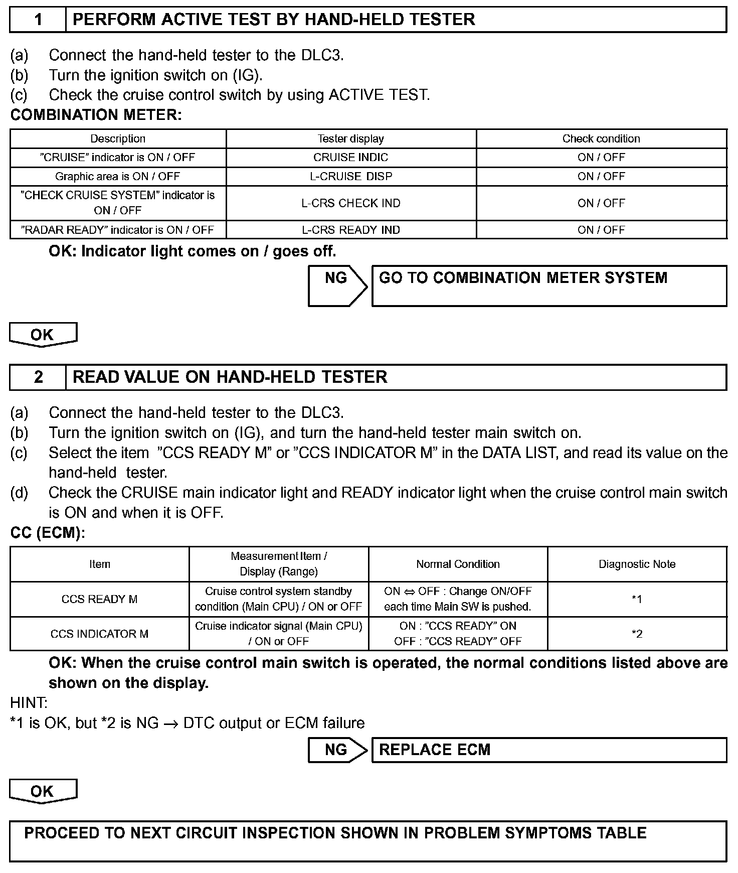 Items such as "Clean Radar Sensor", "Cruise not Available", "Check Cruise System" and "Radar Cruise Ready" are displayed in the multi-information display on the combination meter when the ECM detects signals from each sensor and actuator and sends them to the combination meter via CAN and BEAN.
