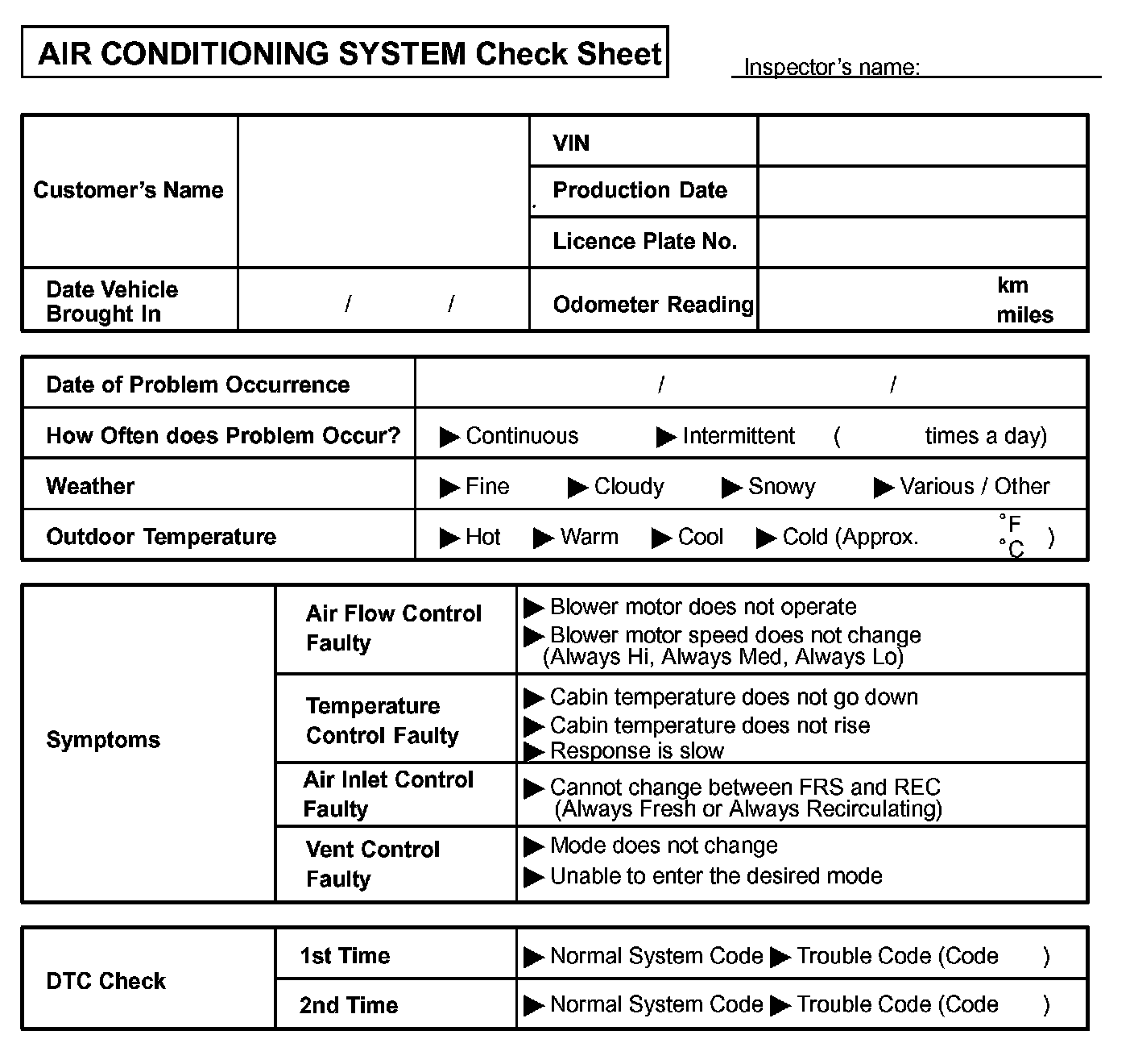 Air Conditioning System Check Sheet: