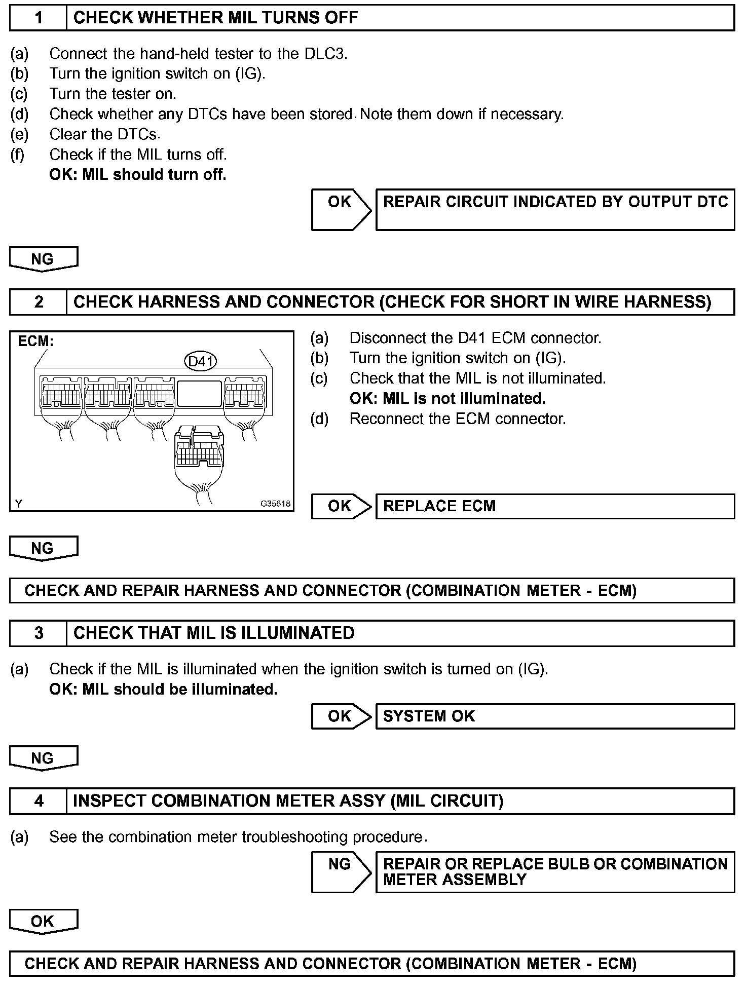 The MIL operation can be checked visually: When the ignition switch is first turned on (IG), the MIL should be illuminated and should then turn off. If the MIL remains illuminated or is not illuminated, conduct the following troubleshooting procedure using the hand-held tester.