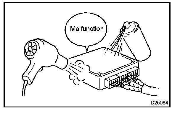 Vibration, heat or water penetration (moisture) is difficult to reproduce. The symptom simulation tests below are effective substitutes for the conditions and can be applied on a stationary vehicle. Important points in the symptom simulation test: