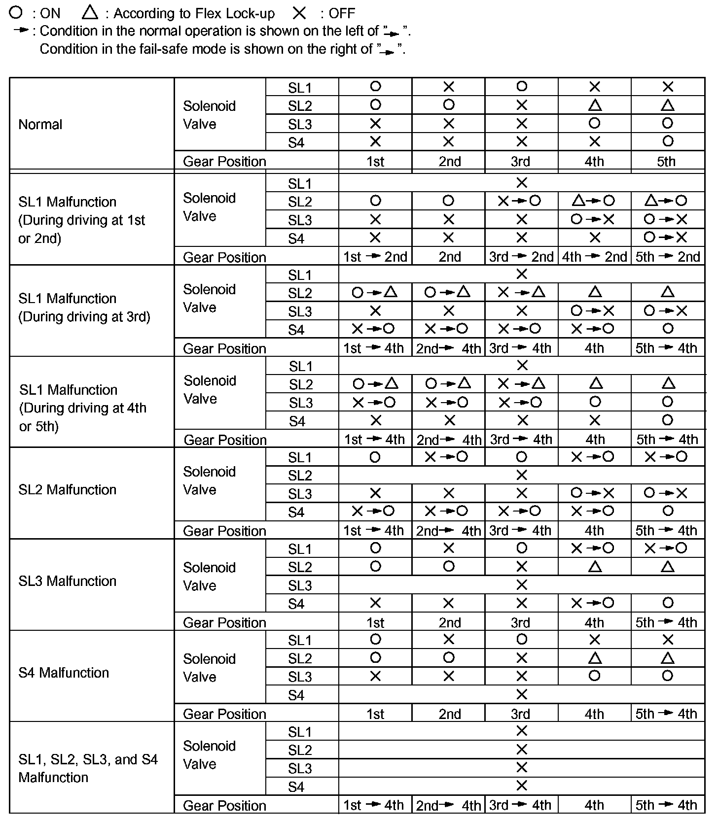 If either of the shift solenoid valve circuits develops an open or short, the ECM turns the other shift solenoid "ON" and "OFF" in order to shift into the gear positions shown in the table.