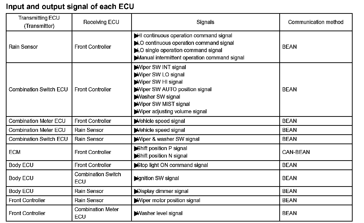 Input and output signal of each ECU