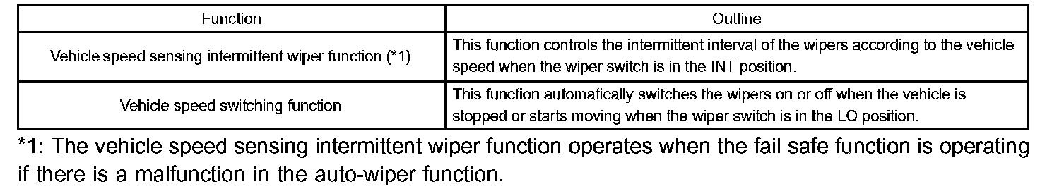 b. While the wipers are operating in intermittent mode from directions from the combination switch, the front controller adjusts the interval between movements of the wiper arm, according to vehicle speed, brake signals, and driving and stopping conditions. The system has the above shown functions.