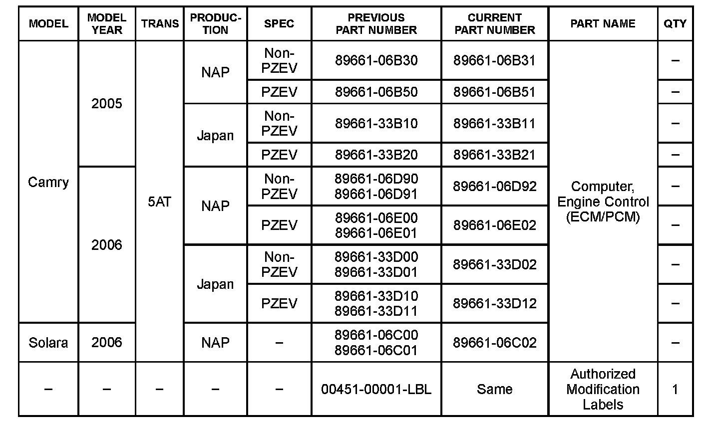 Some 2005 - 2006 model year Camry and 2006 model year Solara vehicles may exhibit a MIL "ON" condition with Diagnostic Trouble Code (DTC) P0500 - Vehicle Speed Sensor "A". The Engine Control Module/ECM (SAE term: Powertrain Control Module/PCM) logic has been modified to reduce the possibility of this condition occurring. Use the following repair procedure to address this condition.