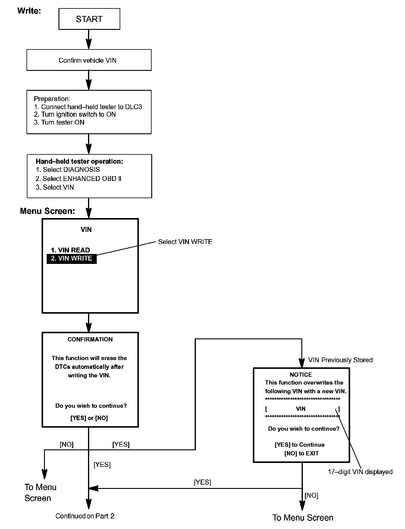 c. Write VIN: Explains the VIN writing process in a flowchart. This process allows the VIN to be input into the ECM. If the ECM is changed, or the VIN and VIN do not match, the VIN can be registered, or overwritten in the ECM by following this procedure.