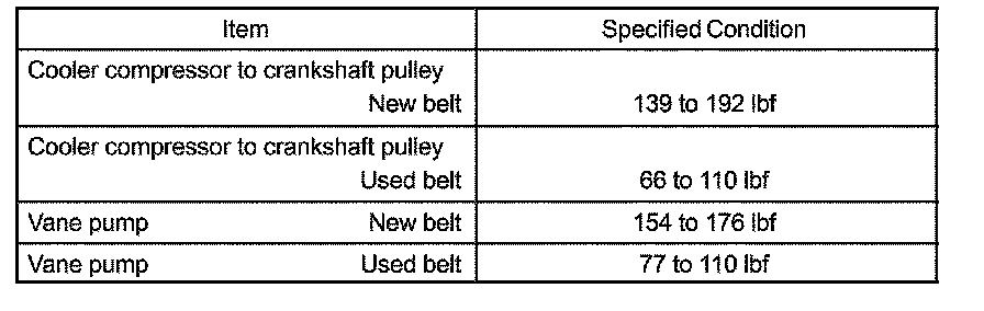 ^ "Used belt" is a belt which has been used on a running engine for 5 minutes or more. After installing a new belt, run the engine for approximately 5 minutes and then recheck the tension.