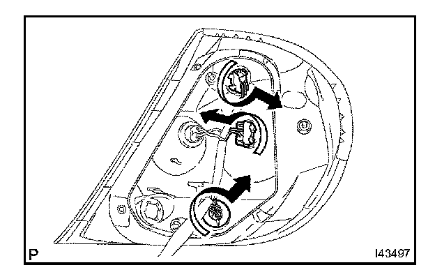 a. Turn in the direction indicated by the arrow and remove the rear combination lamp socket & wire sub-assembly RH and the rear combination lamp bulb as a unit.