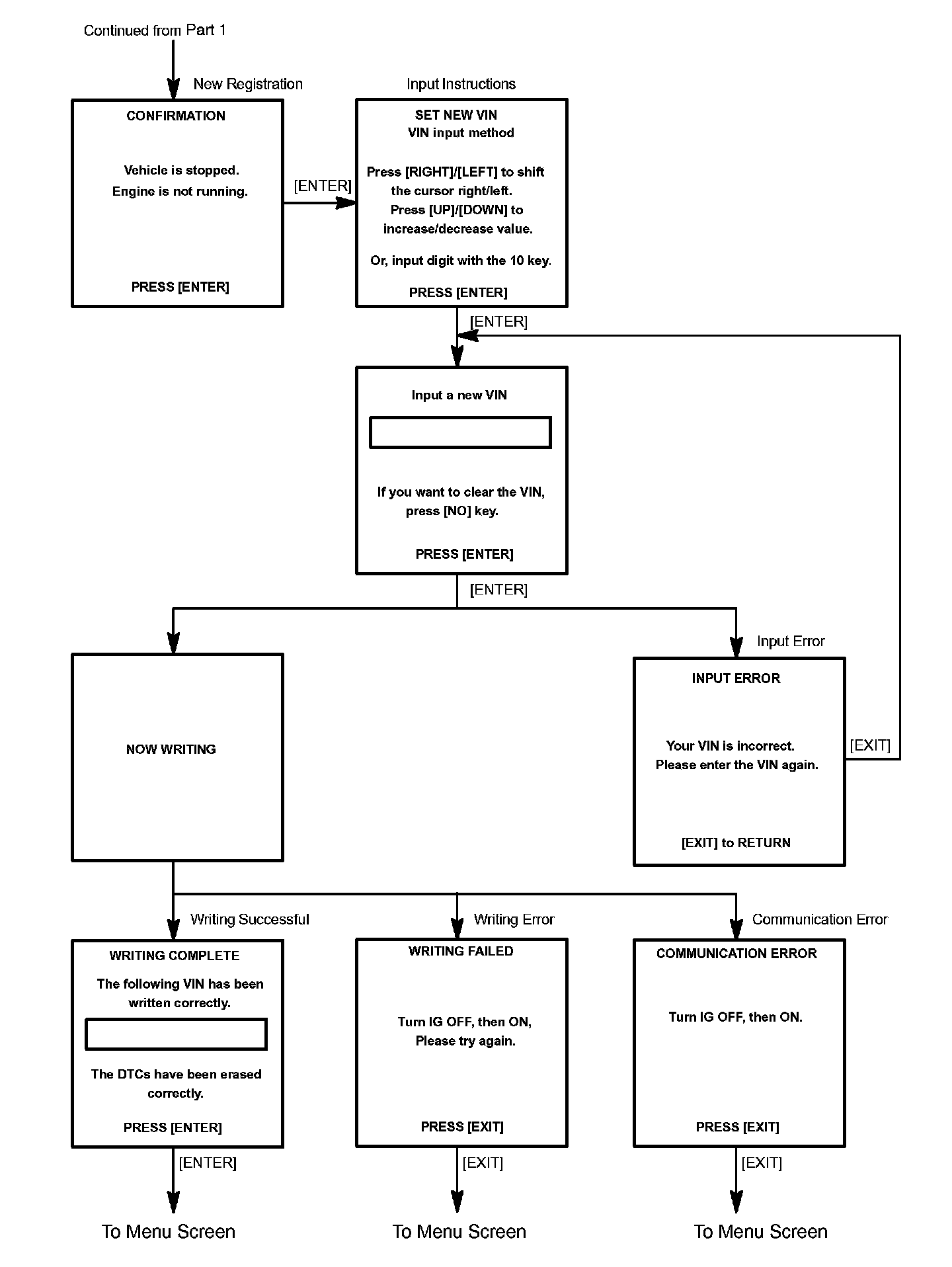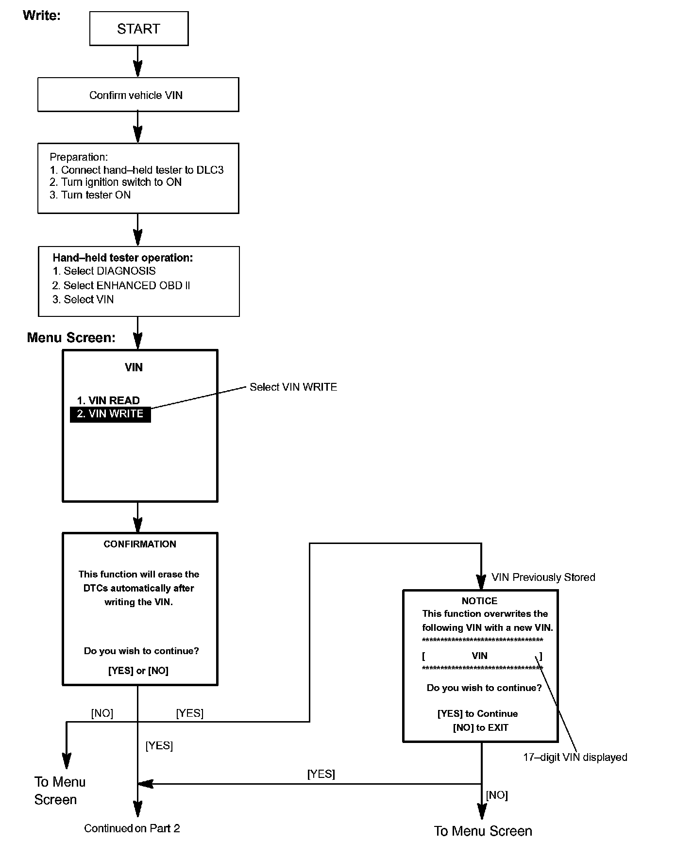 c. Write VIN: Explains the VIN writing process in a flowchart. This process allows the VIN to be input into the ECM. If the ECM is changed, or the VIN and VIN do not match, the VIN can be registered, or overwritten in the ECM by following this procedure.