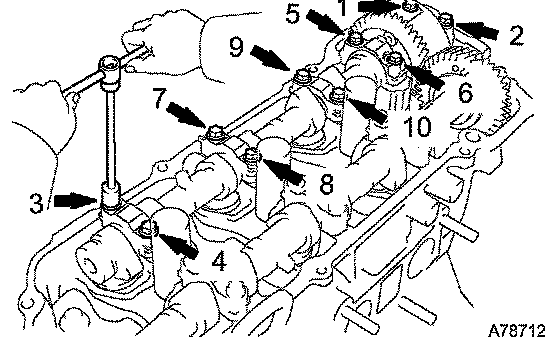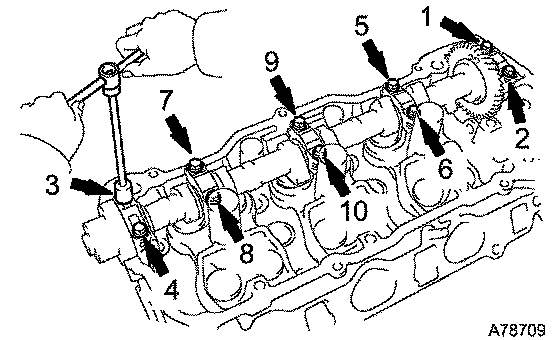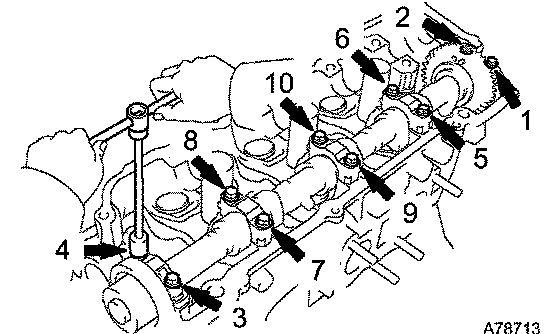 c. Uniformly loosen and remove the 10 bearing cap bolts in the sequence shown in the illustration. Remove the 5 bearing caps and the camshaft.