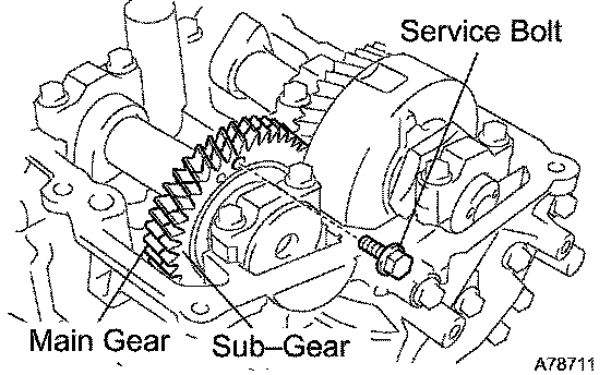 b. Secure the exhaust camshaft sub-gear to the main gear with a service bolt.