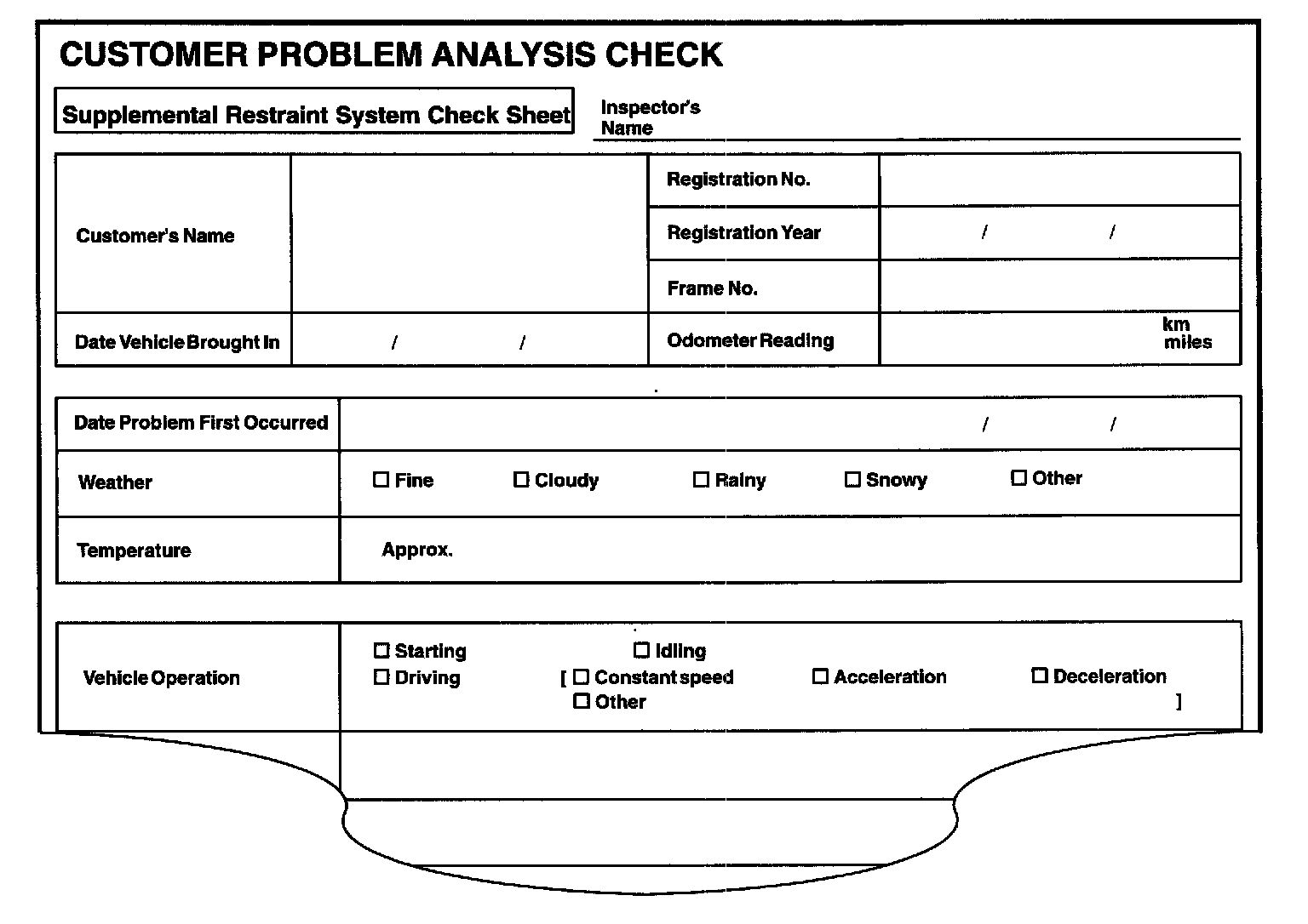 - The following 5 items are important points in the problem analysis. Past problems which are thought to be unrelated and the repair history, etc. may also help in some cases. So, as much information as possible should be gathered and its relationship with the problem symptoms should be correctly ascertained for a reference in troubleshooting. A customer problem analysis table is provided in the Diagnostics section for each system for your use.