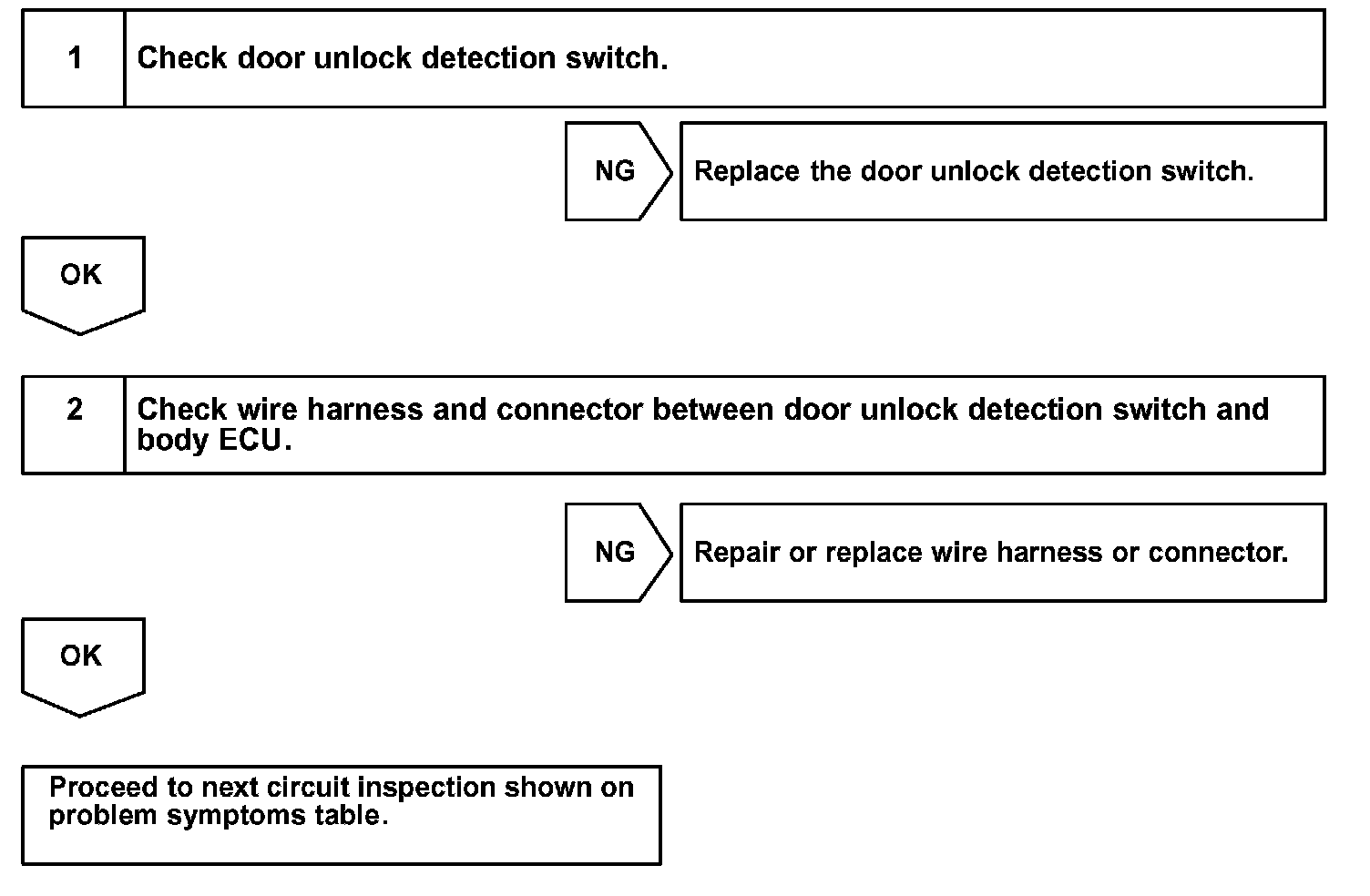 The door unlock detection switch is built in the door lock motor assembly. This switch is ON when the door lock knob is in the unlock position and OFF when the lock knob is in the lock position. The ECU detects the door lock knob conditions in this circuit. This system is used as one of the operating conditions for the key confinement prevention function.
