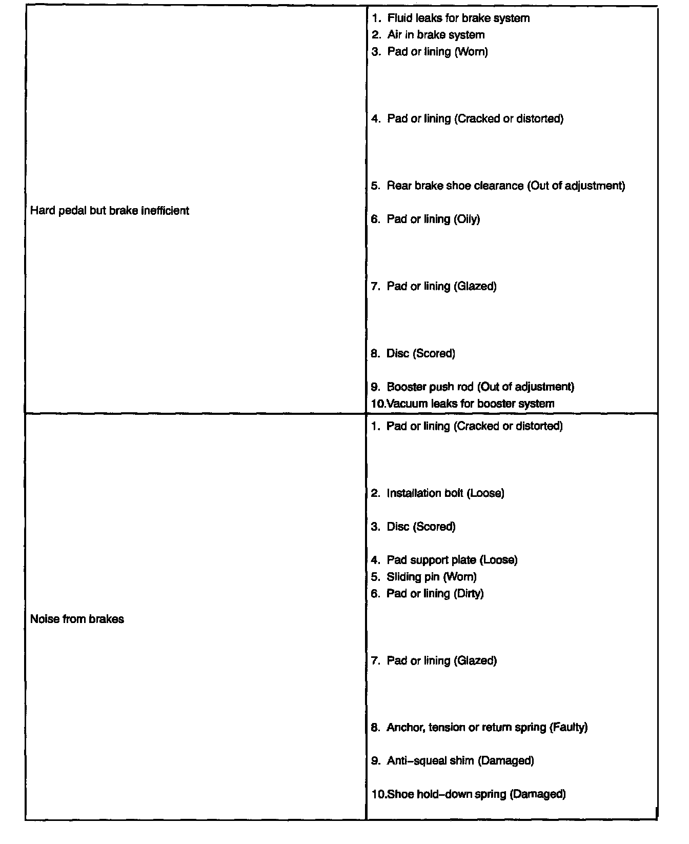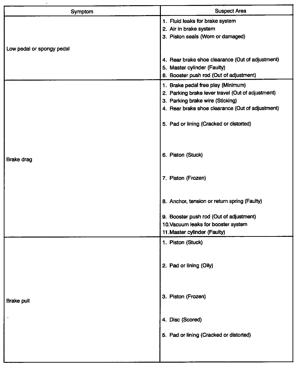 PROBLEM SYMPTOMS TABLE