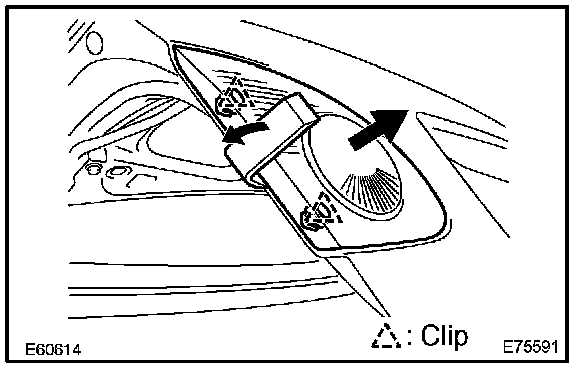 c. Using a moulding remover, remove the 2 clips and back up lamp assembly LH.
