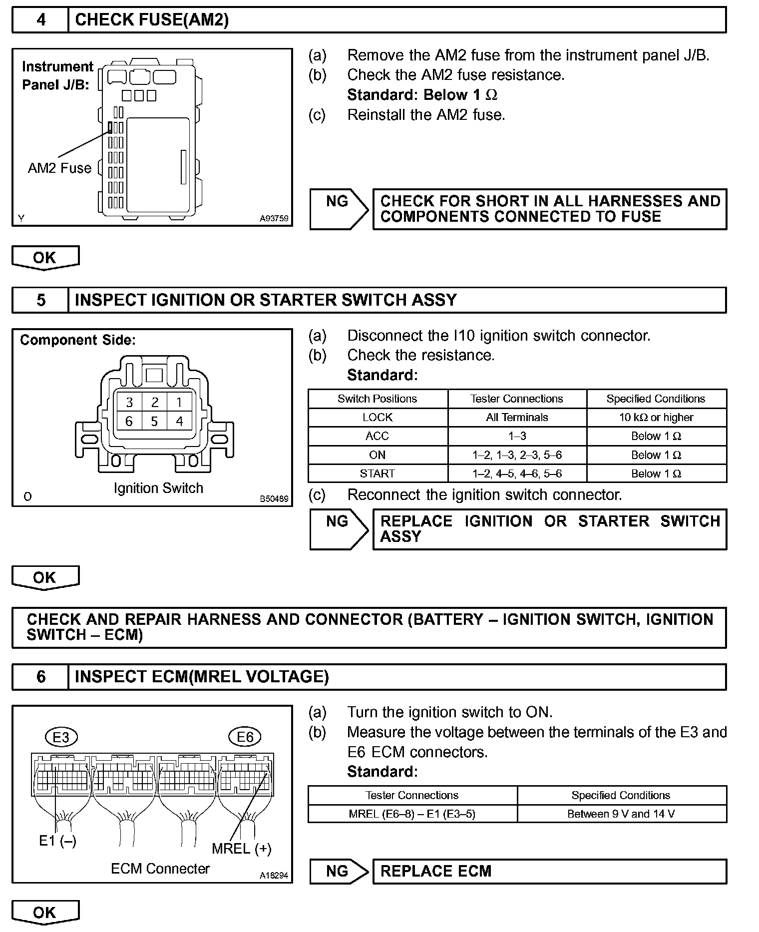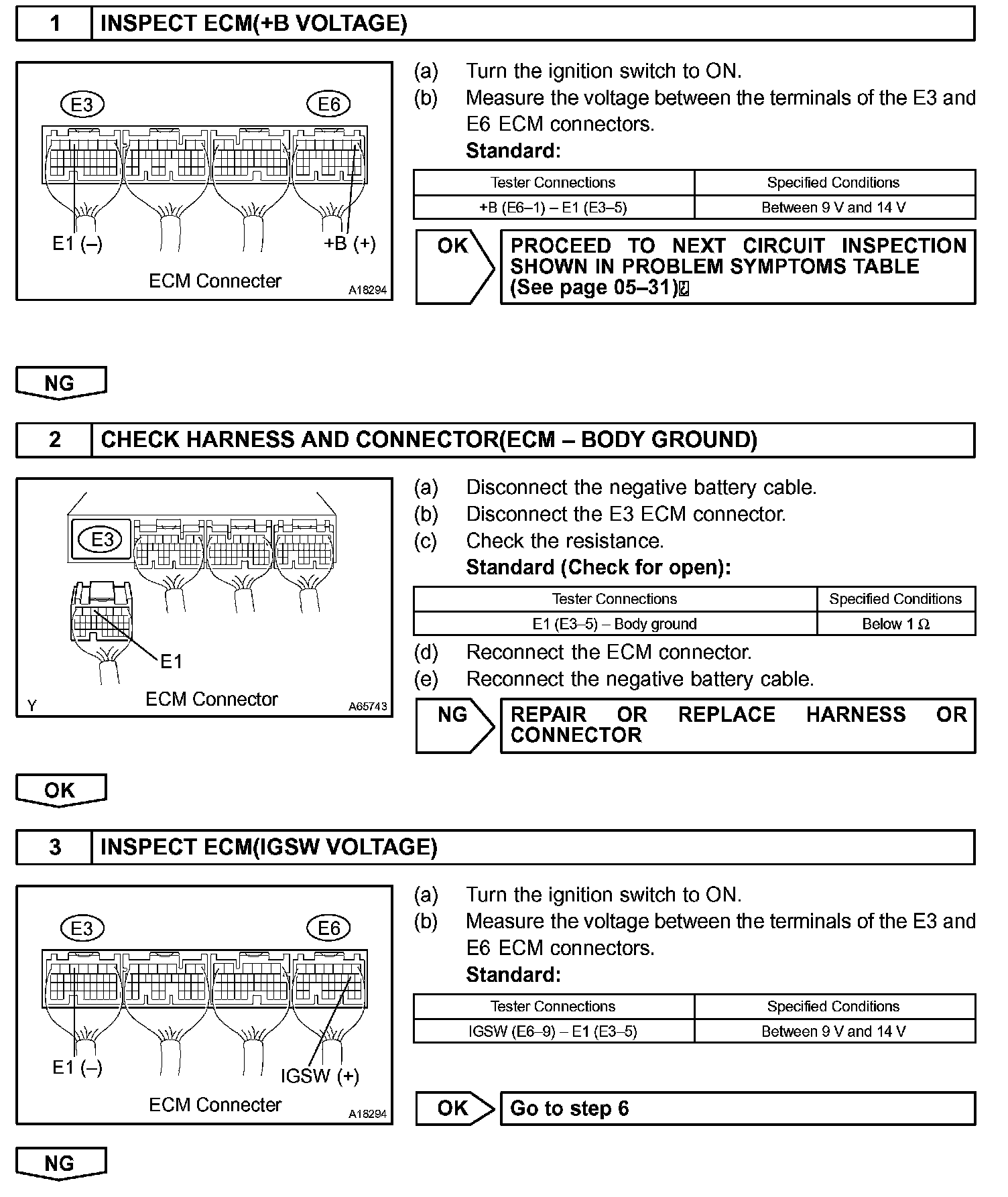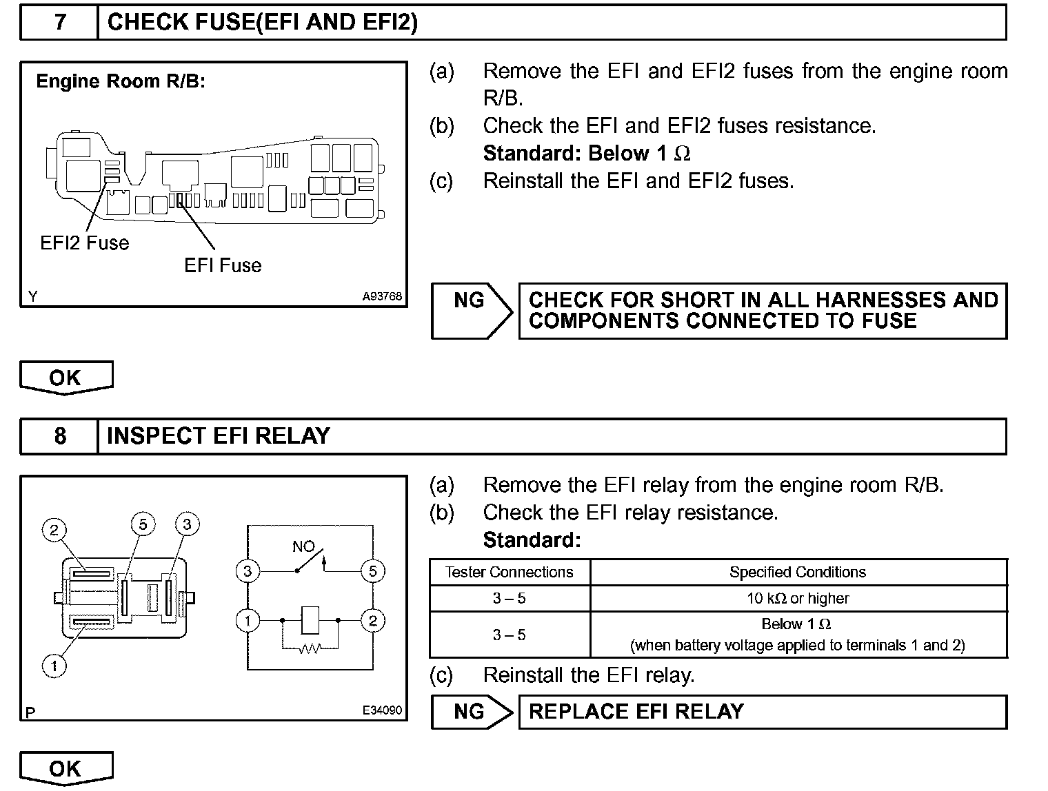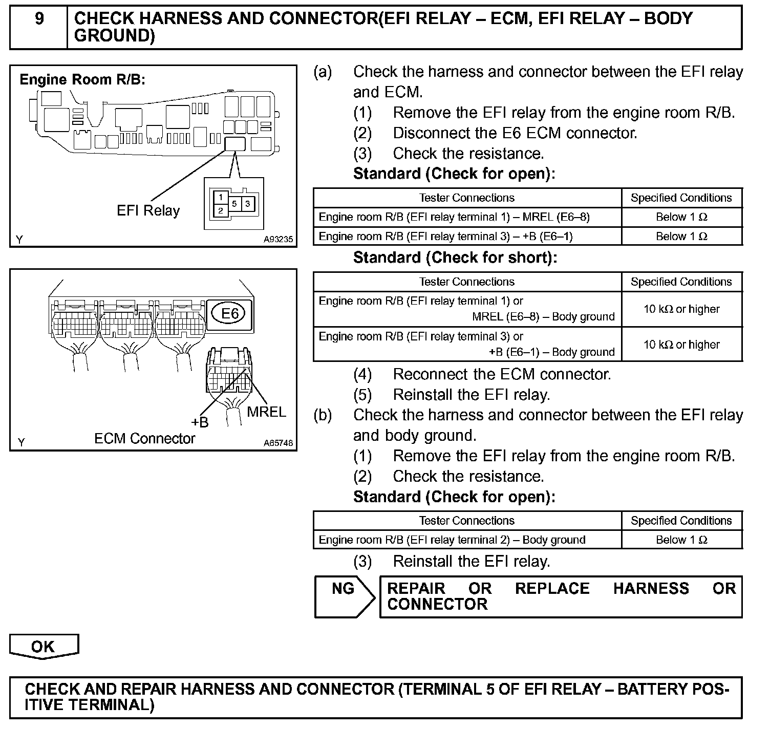 When the ignition switch is turned to ON, the battery voltage is applied to terminal IGSW of the ECM. The ECM MREL output signal causes a current to flow to the coil, closing the contacts of the EFI relay and supplying power to terminal +B of the ECM.