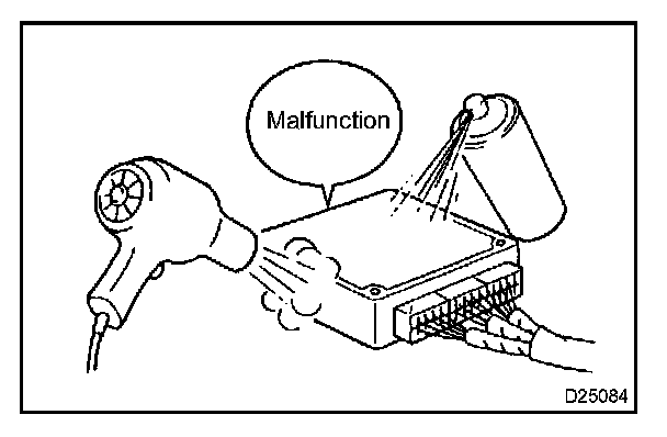 Vibration, heat or water penetration (moisture) is difficult to reproduce. The symptom simulation tests below are effective substitutes for the conditions and can be applied on a stationary vehicle.