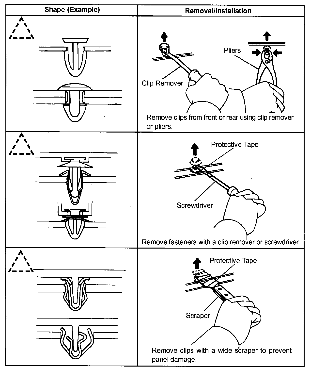1. The removal and installation methods of typical clips used in body parts are shown in the table.