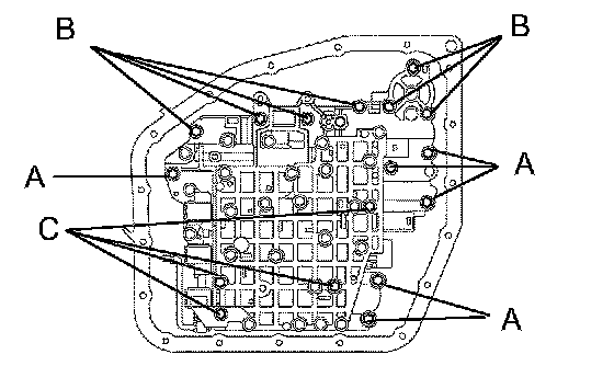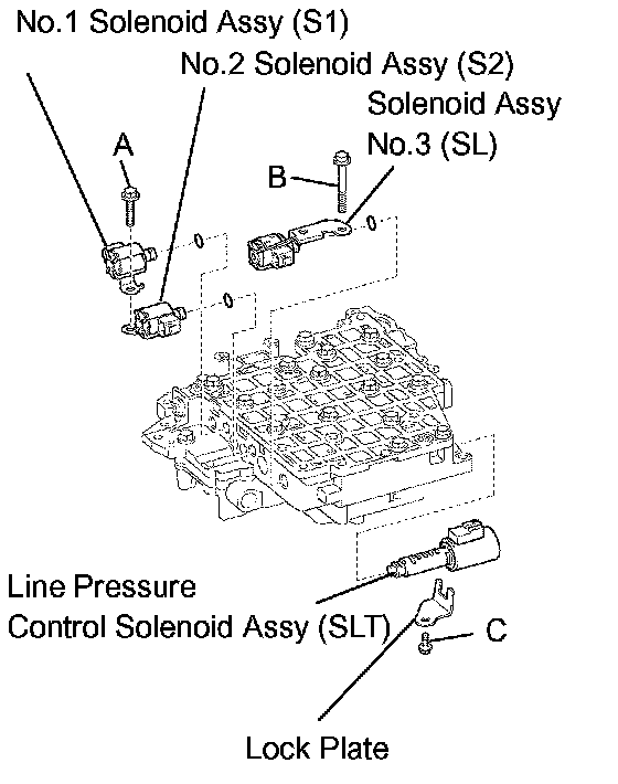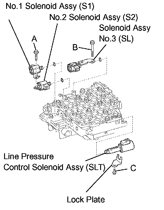 d. Install the line pressure control solenoid valve and lock plate with the bolt (C bolt).