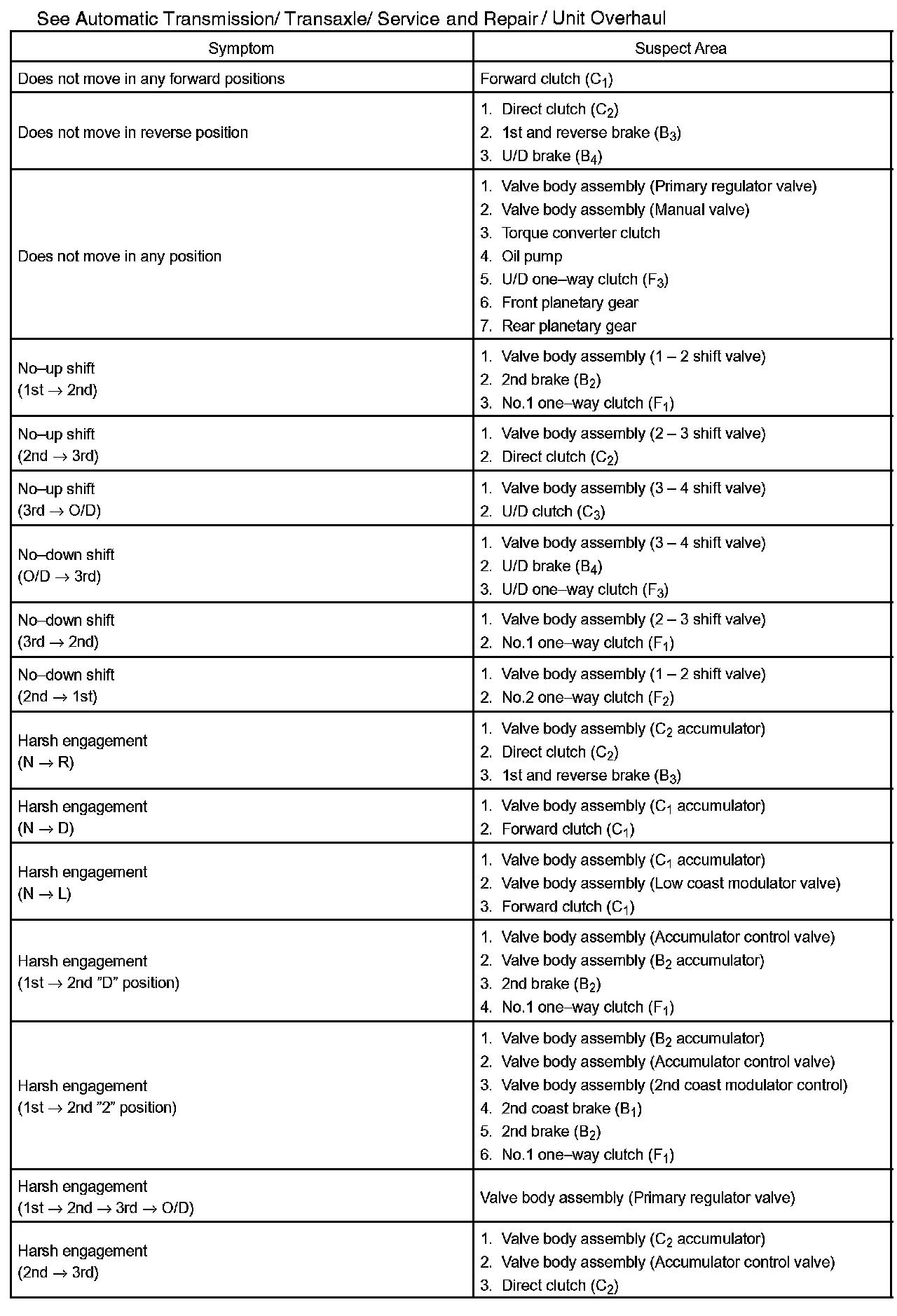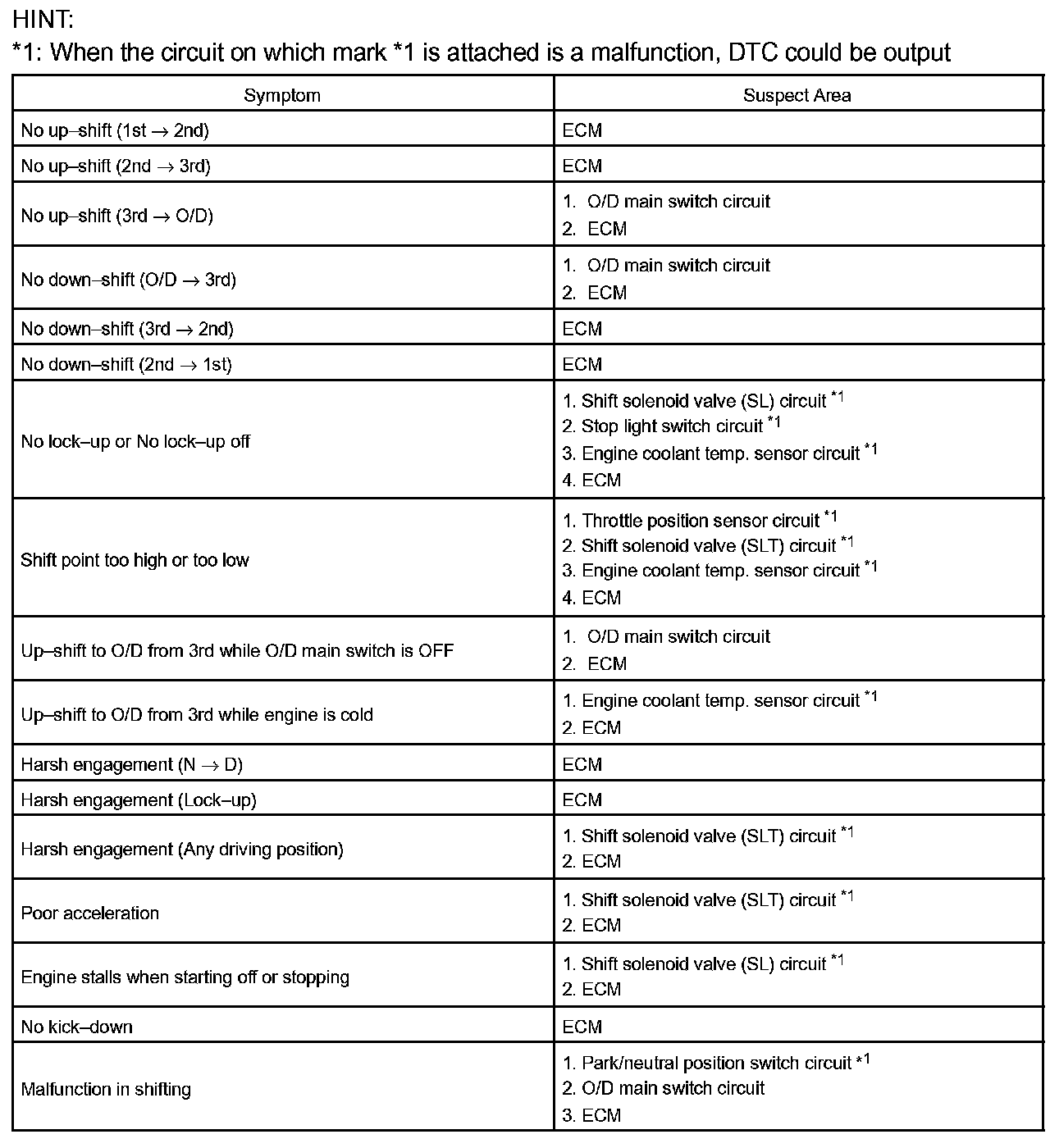 PROBLEM SYMPTOMS TABLEHINT: If a normal code is displayed during the diagnostic trouble code check although the trouble still occurs, check the electrical circuits for each symptom in the order given in the charts and proceed to the troubleshooting.