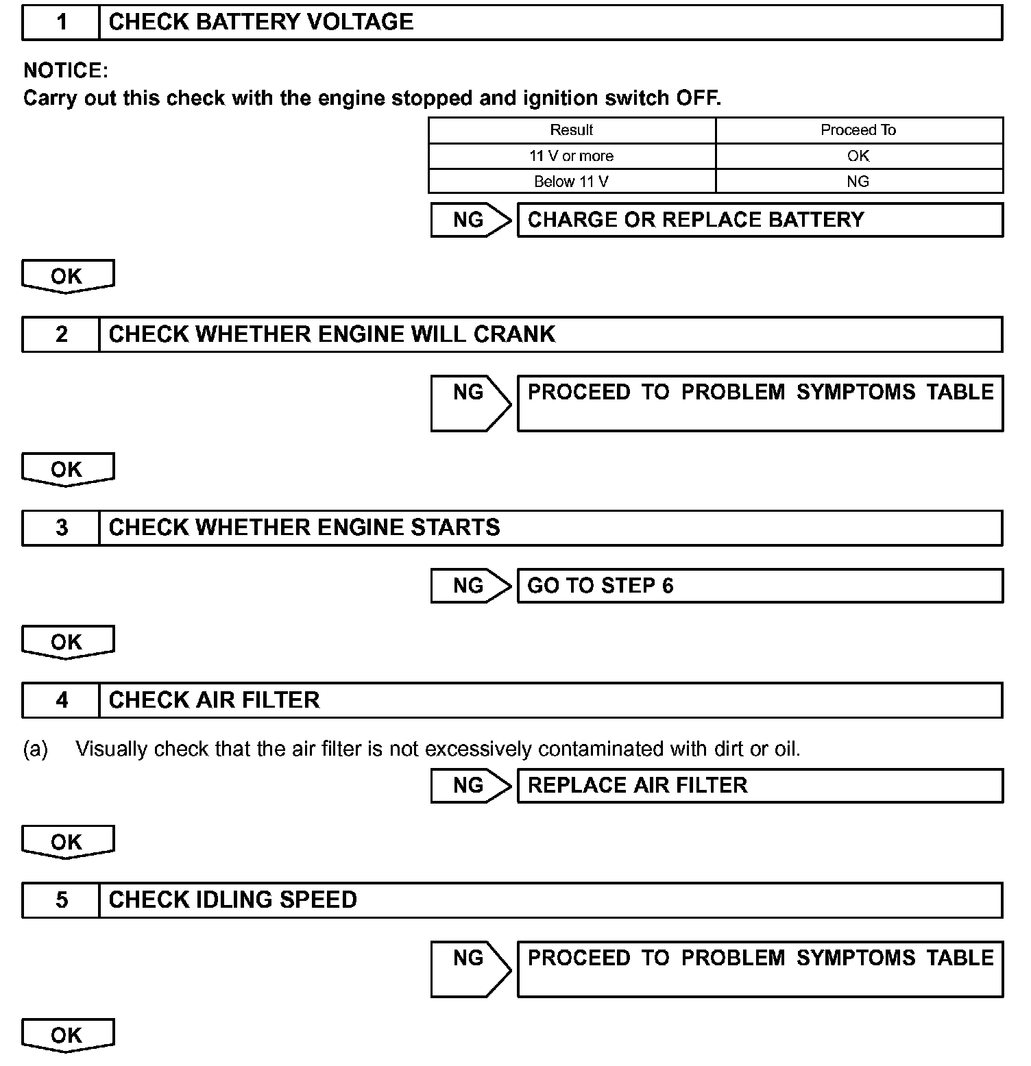 When a malfunction is not confirmed by the DTC check, troubleshooting should be carried out in all circuits considered to be possible causes of the problem. In many cases, by carrying out the basic engine check shown in the flowchart, the location of the problem can be found quickly and efficiently. Therefore, using this check is essential when engine troubleshooting.
