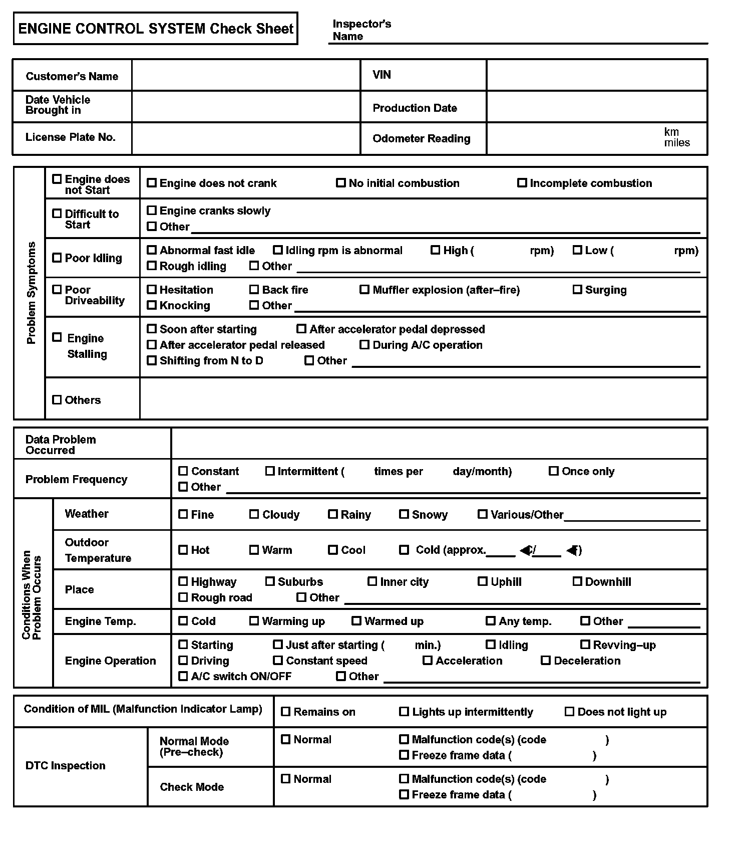 Engine Control System Check Sheet: