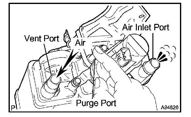 1. While holding the purge port closed, blow air at 1.67 kPa (17.0 gf/cm2, 0.24 psi) into the vent port, and check that the air flows from the air inlet port.