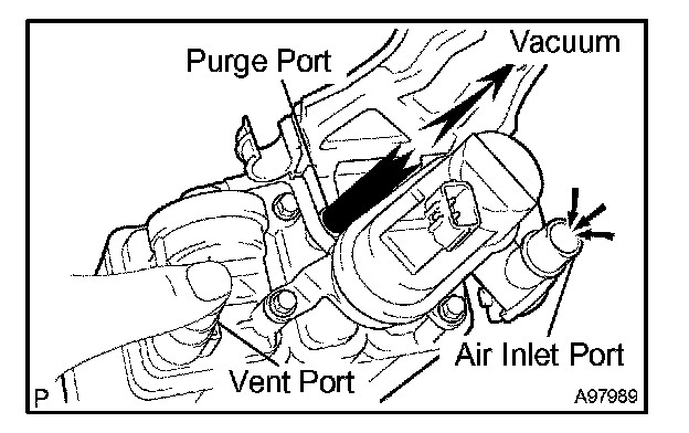2. While holding the vent port closed, apply a vacuum of 1.10 kPa (8.3 mmHg, 0.32 in.Hg) into the purge port, and check that the air flows from the air inlet port.