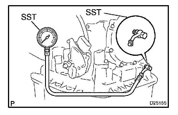 2. Remove the test plug on the left side of the transaxle case and connect SST.