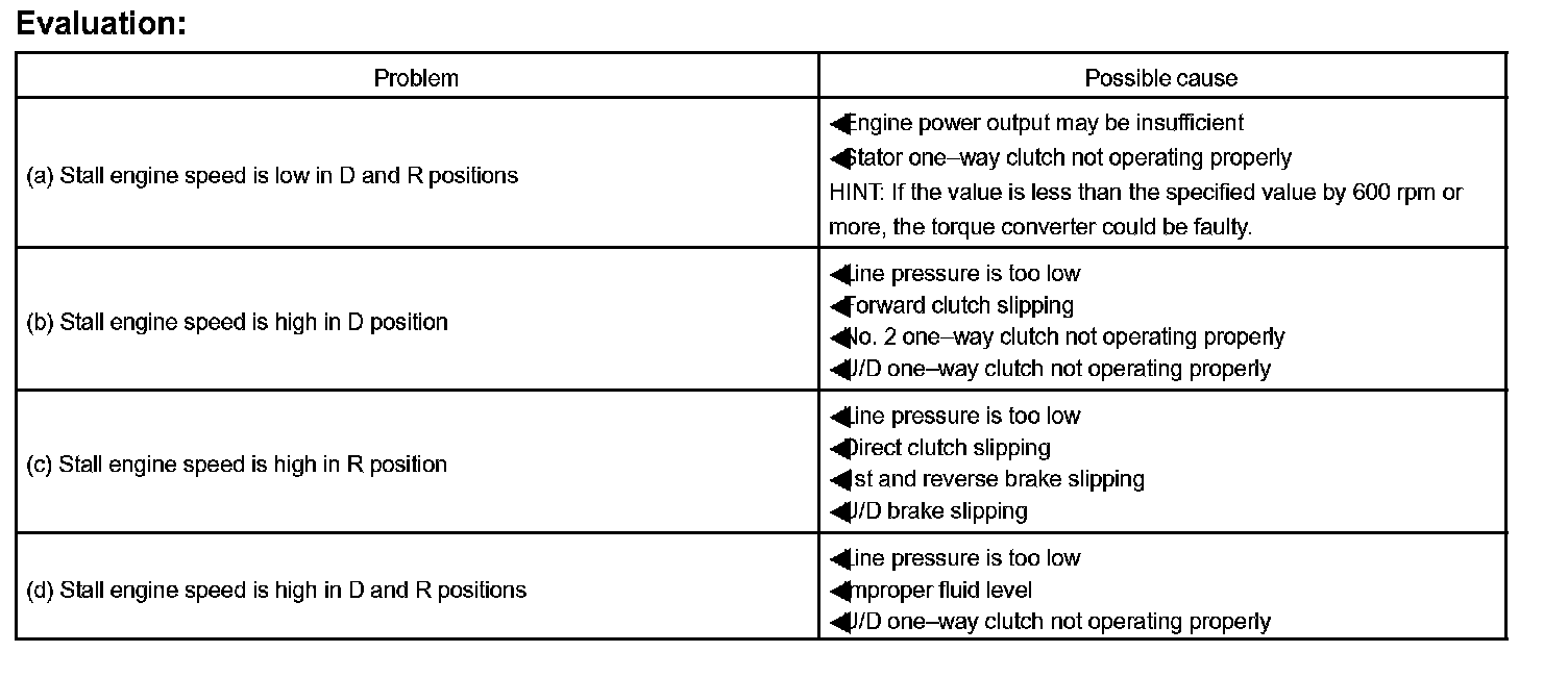The object of this test is to check the overall performance of the transaxle and engine by measuring the stall speeds in the D and R positions.