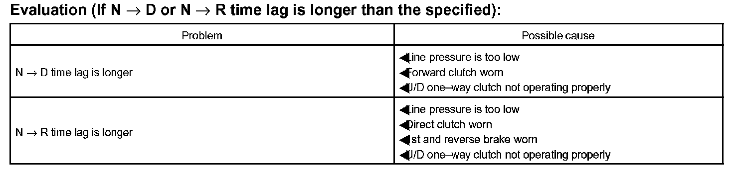 1. When the shift lever is shifted while the engine is idling, there will be a certain time lapse or lag before the shock can be felt. This is used for checking the condition of the direct clutch, forward clutch, and 1st and reverse brake.