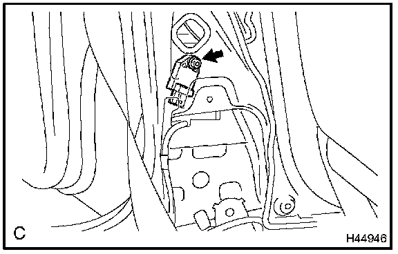 - When installing the side airbag sensor assembly LH, be careful that the SRS wiring does not interfere with other parts and that it is not pinched between other parts.