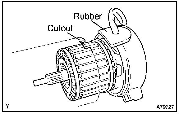 a. Align the rubber with the cutout of the starter yoke, then install the starter commutator end frame onto the starter yoke.