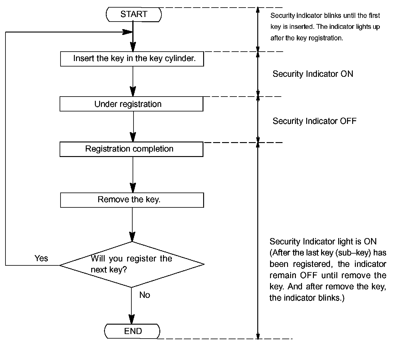 - When a key is not inserted in the key cylinder on the automatic registration mode, the security indicator always lights on.
