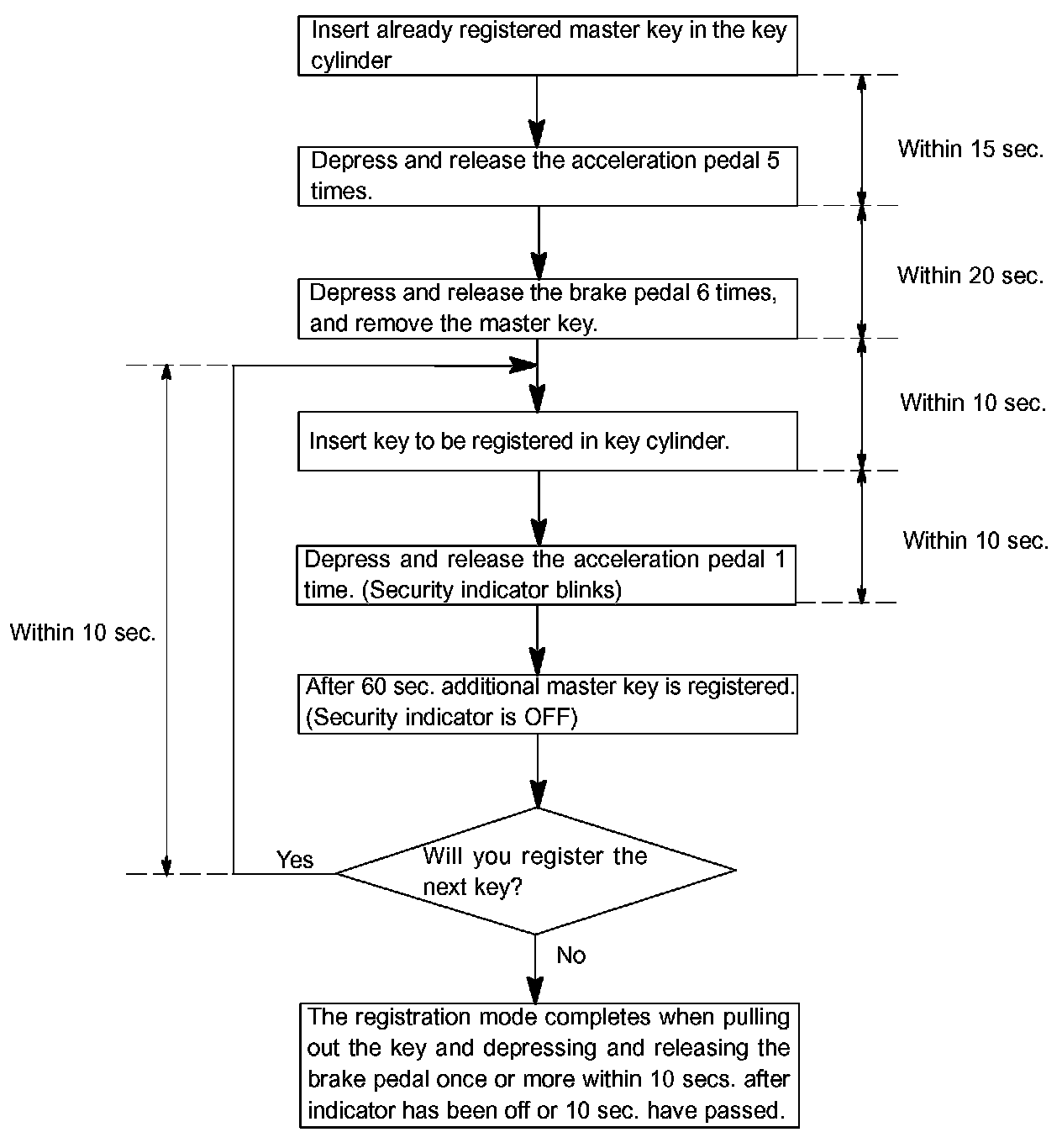 There are 2 ways for registration of additional master key, one way is depressing brake pedal and acceleration pedal and the other way is using hand-held tester.