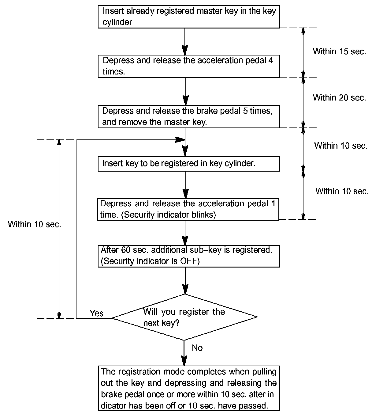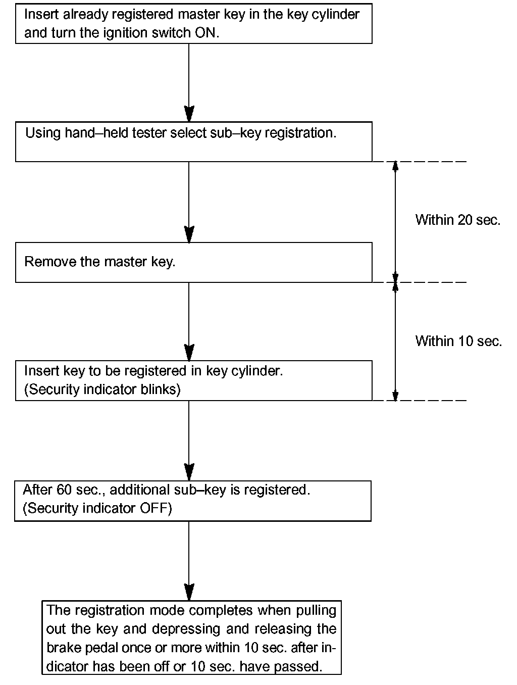There are 2 ways for registration of additional sub-key, one way is depressing brake pedal and acceleration pedal and the other way is using hand-held tester.