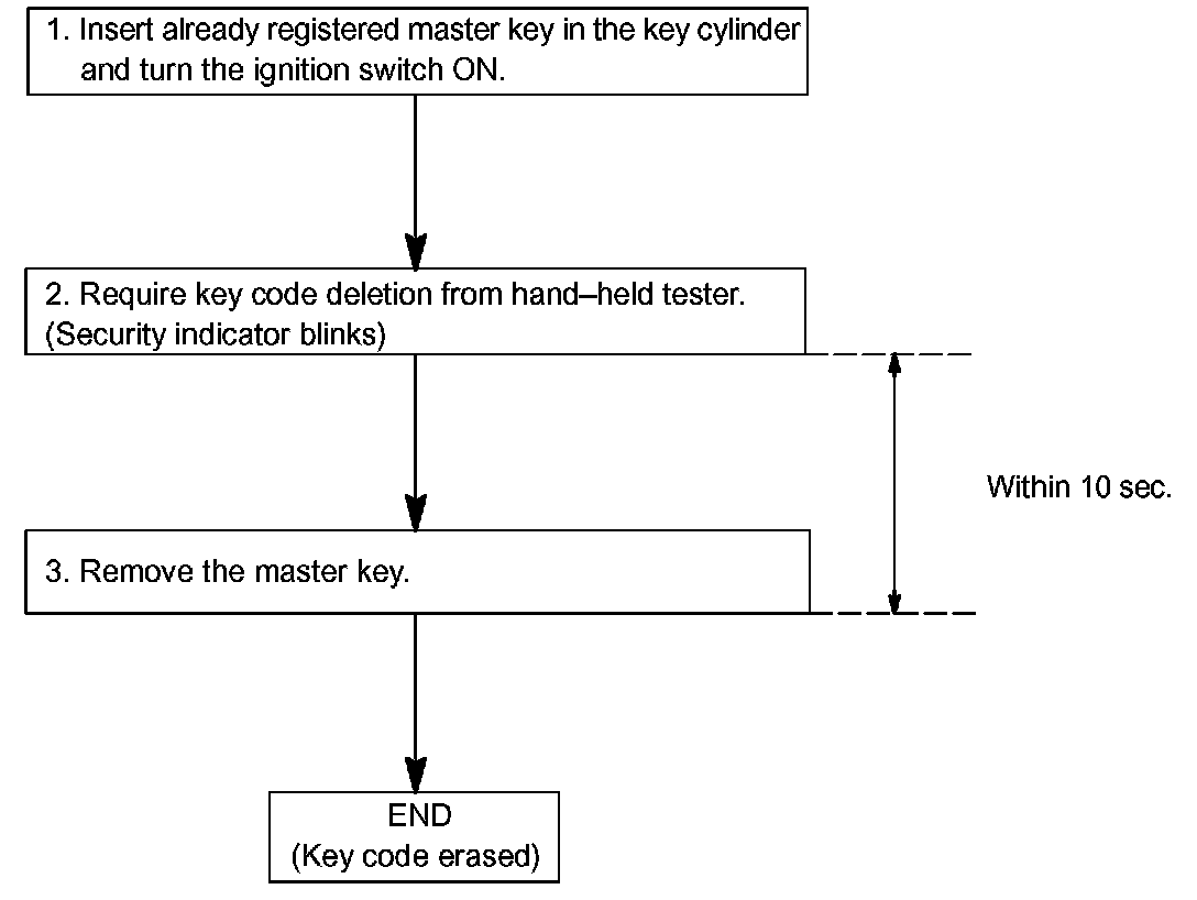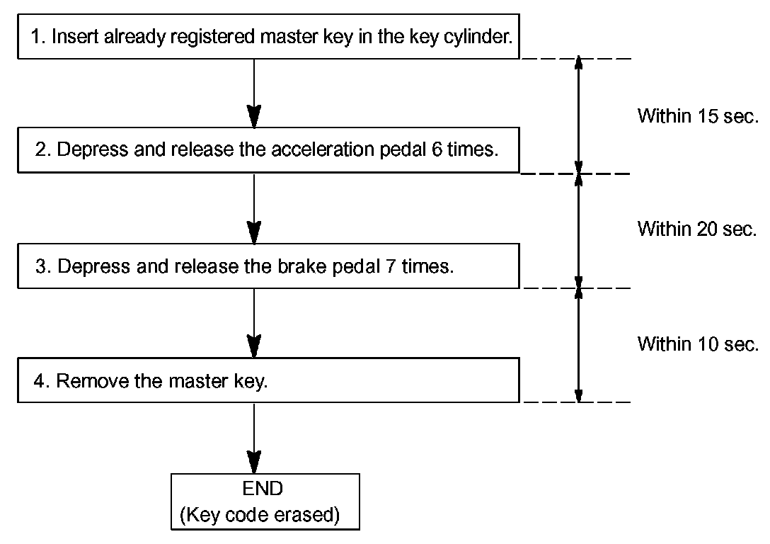 - When replacing "Ignition Cylinder Key Set" or "Lock Cylinder Set" and register according to the following procedure using the original master key. However, after the registration of the additional master key, as the original master key and the original sub-key is not necessary any more, so erase registration of those key codes.