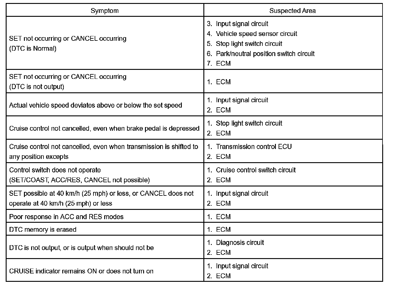 Problem Symptoms Table: