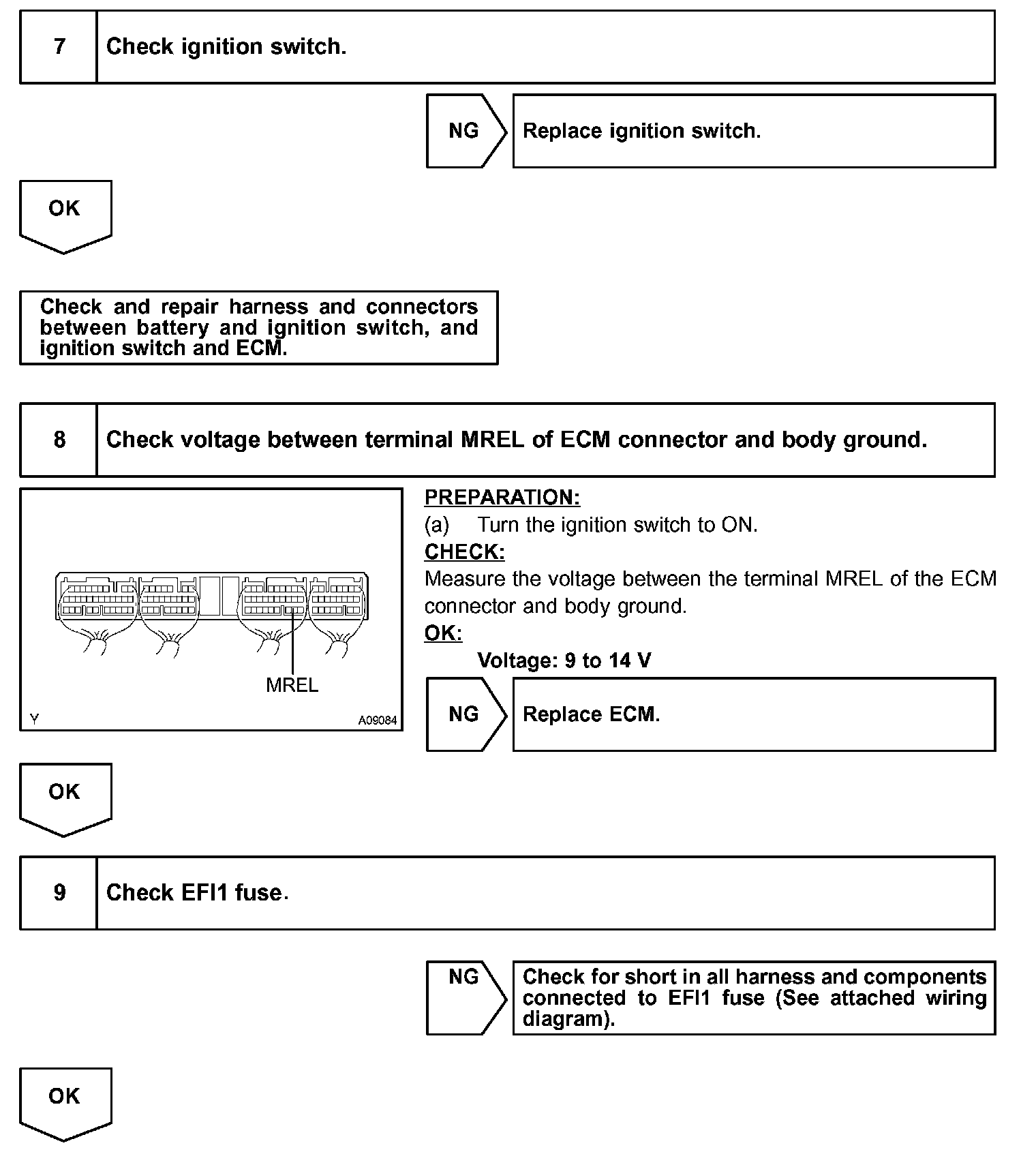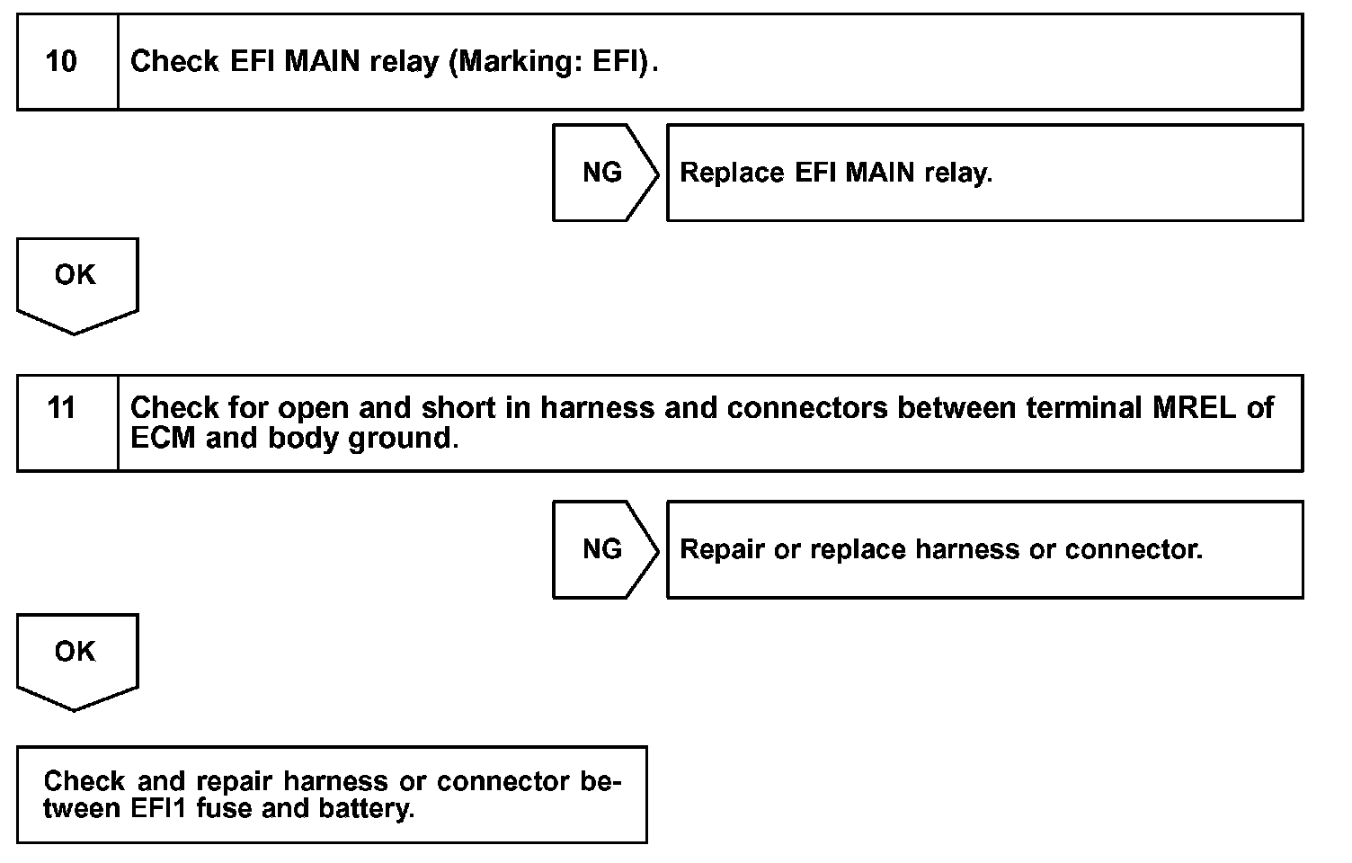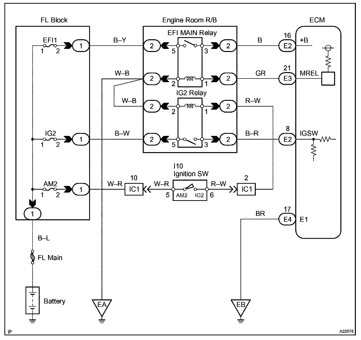 When the ignition switch is turned ON, battery positive voltage is applied to the IG2 relay and terminal IGSW of the ECM. Then the EFI main relay (Marking: EFI MAIN) control circuit in the ECM sends a signal to terminal MREL of the ECM, switching on the EFI main relay.
