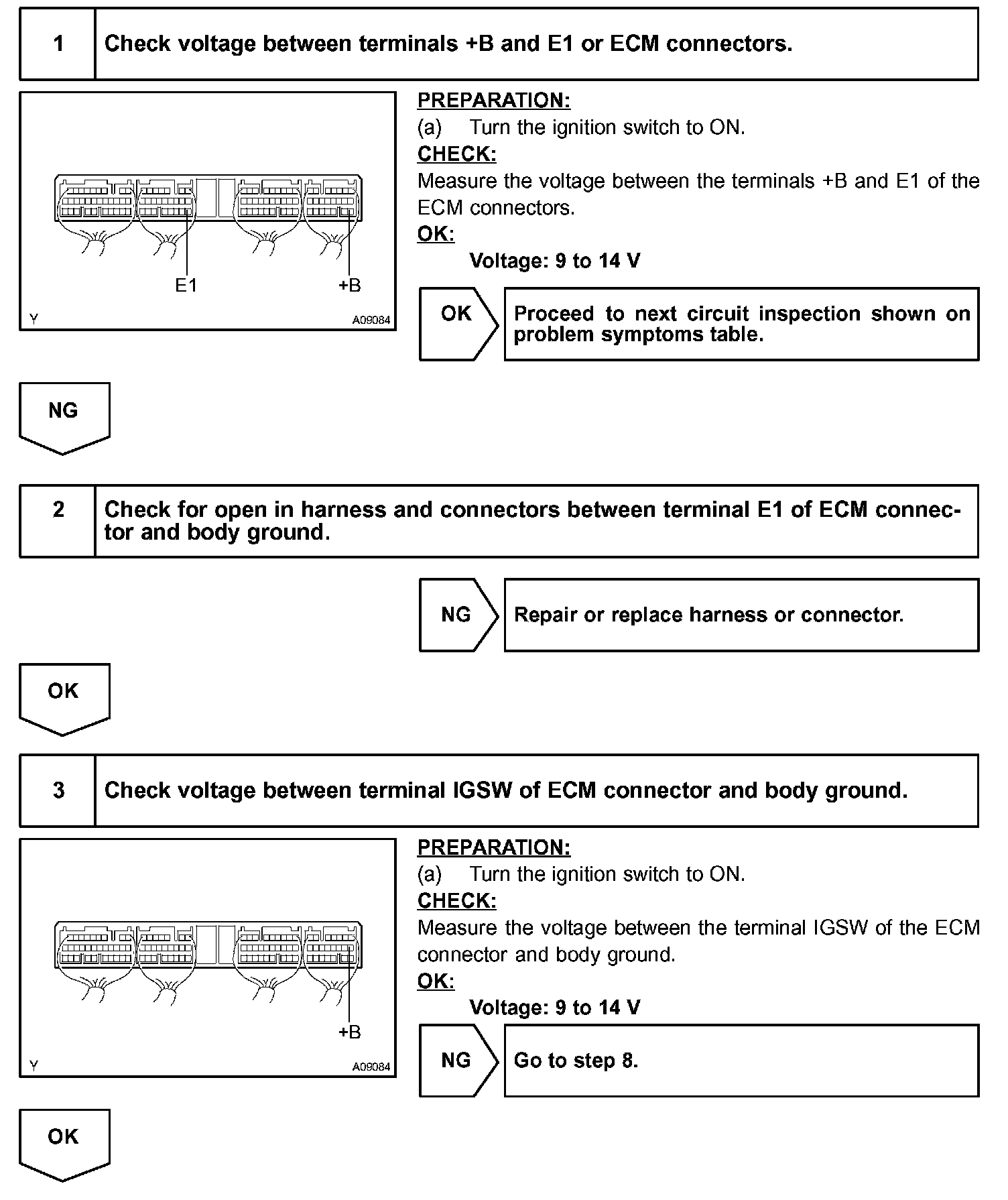 This signal causes current to flow to the coil, closing the contacts of the EFI main relay and supplying power to terminals +B of the ECM.