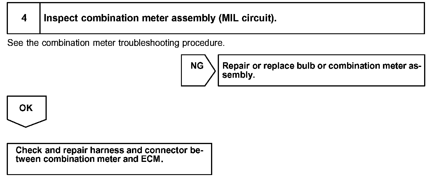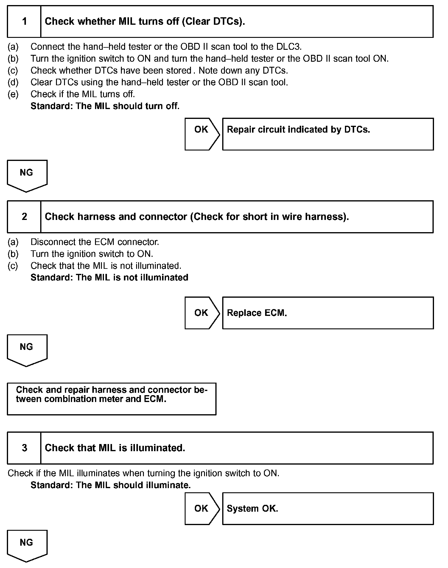 When the ignition switch is first turned to ON, the MIL should be illuminated. If it is always OFF or always ON, use the hand-held tester or OBD II scan tool and follow the procedure to determine cause of the problem.