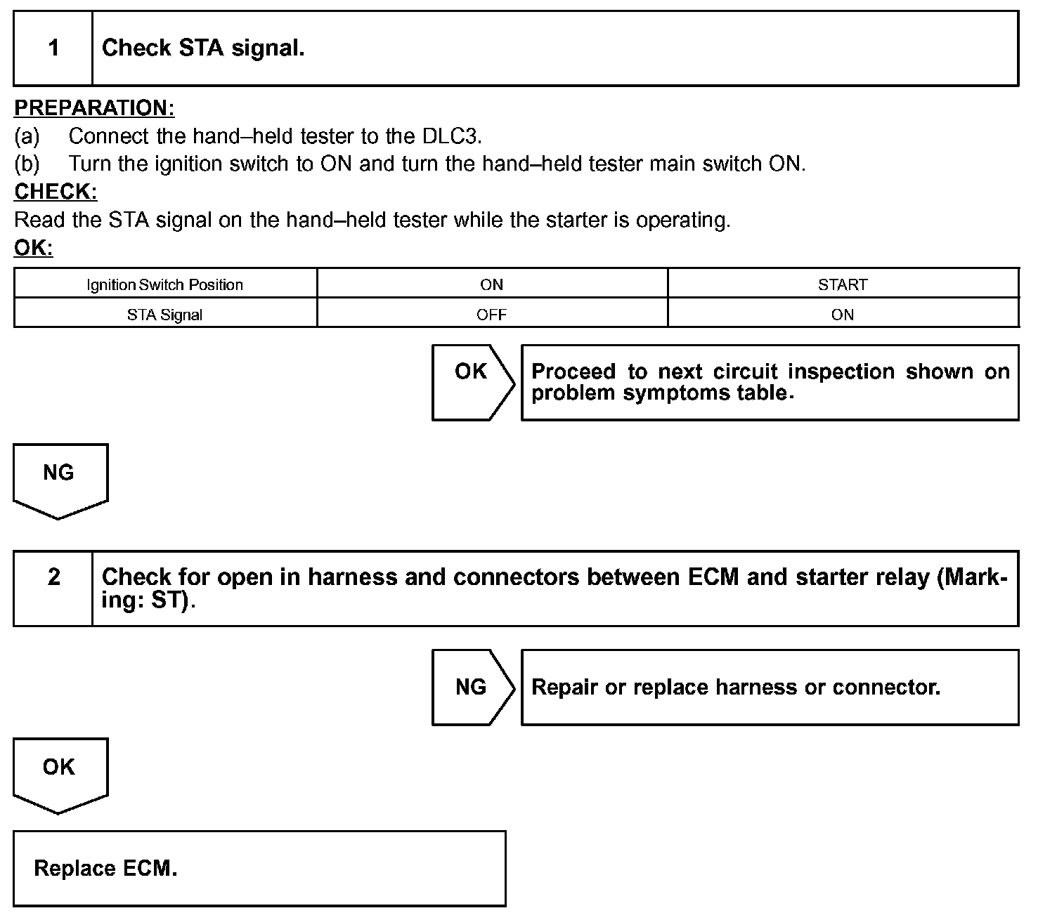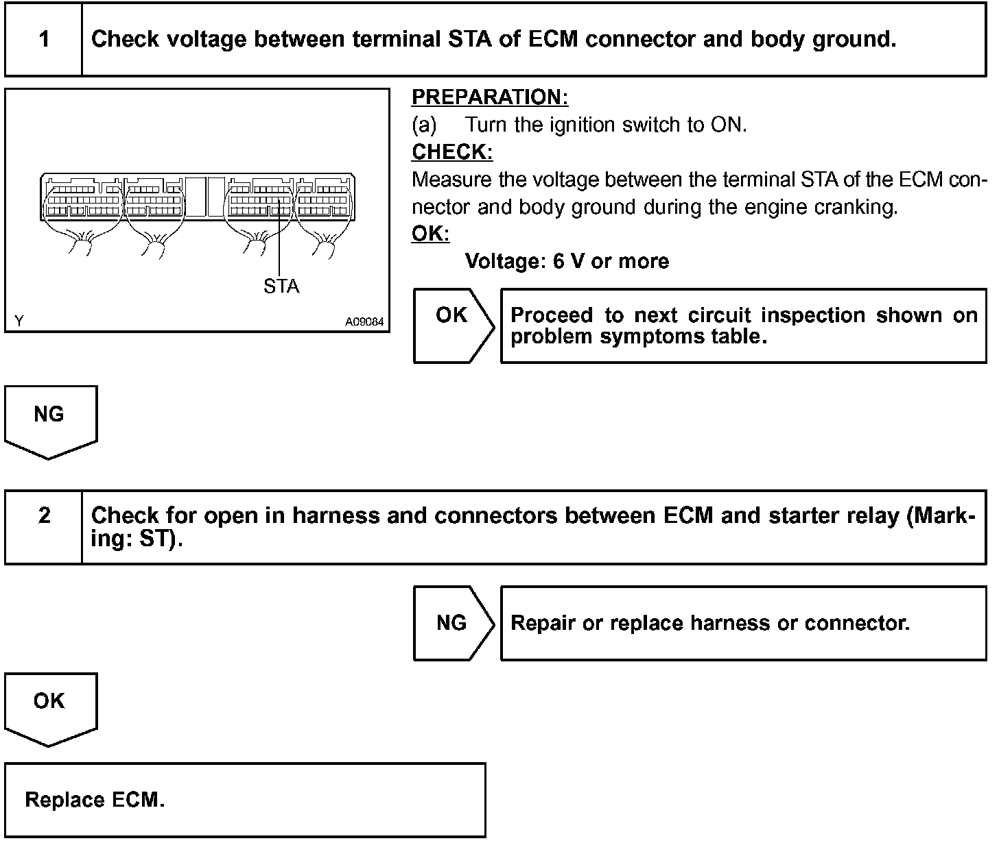 When the engine is cranked, the intake air flow is slow, resulting in a poor fuel vaporization is poor. A rich mixture is therefore necessary in order to achieve good startability. While the engine is being cranked, the battery voltage is applied to terminal STA of the ECM. The starter signal is mainly used to increase the fuel injection volume for the starting injection control and after-start injection control.
