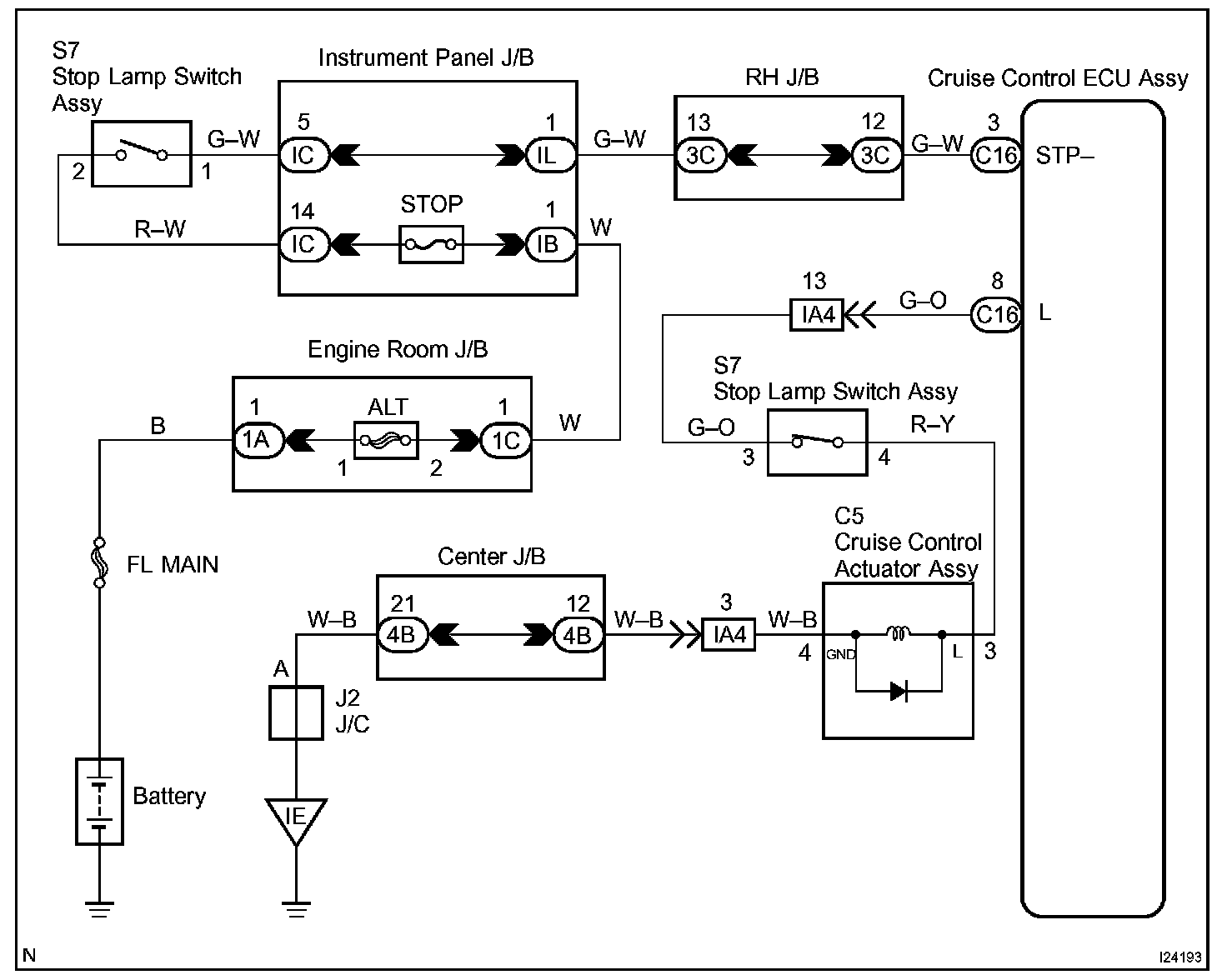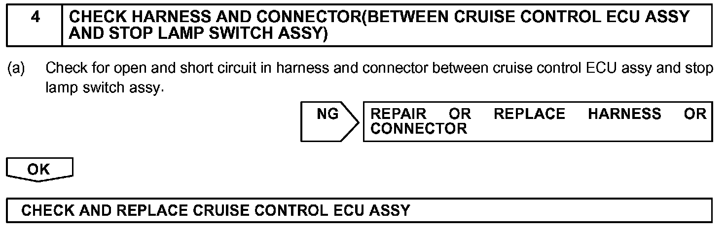 When the brake pedal is depressed, normal battery positive voltage normally is applied through the STOP fuse and stop lamp switch assy to terminal STP- of the cruise control ECU assy, and the cruise control ECU assy turns the cruise control to off.