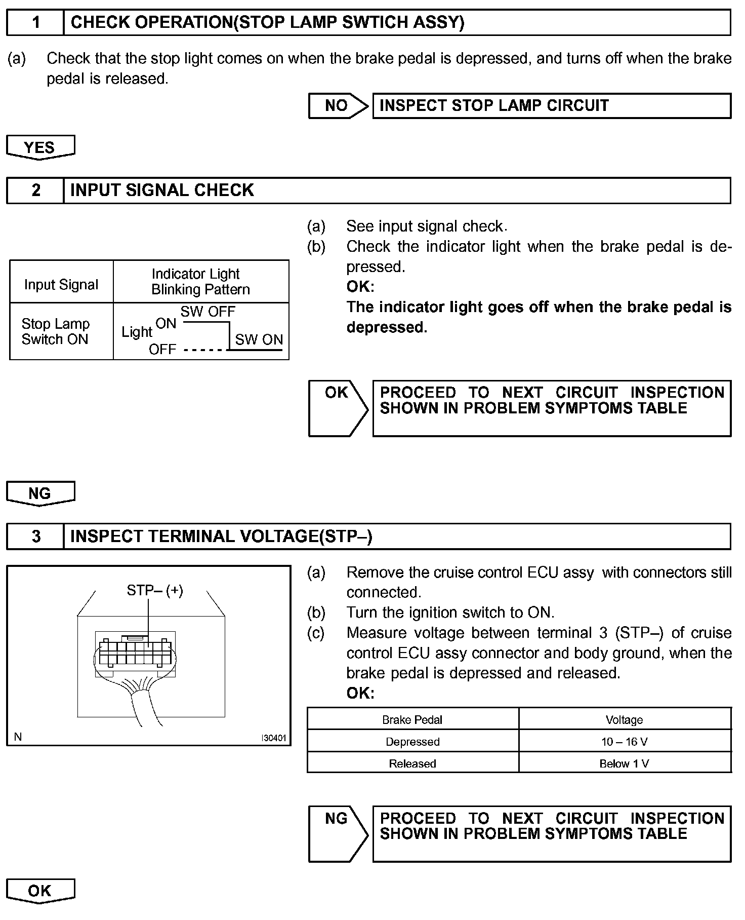 If the harness connected to terminal STP- has an open circuit, terminal STP- will have battery positive voltage and the cruise control will be turned off.