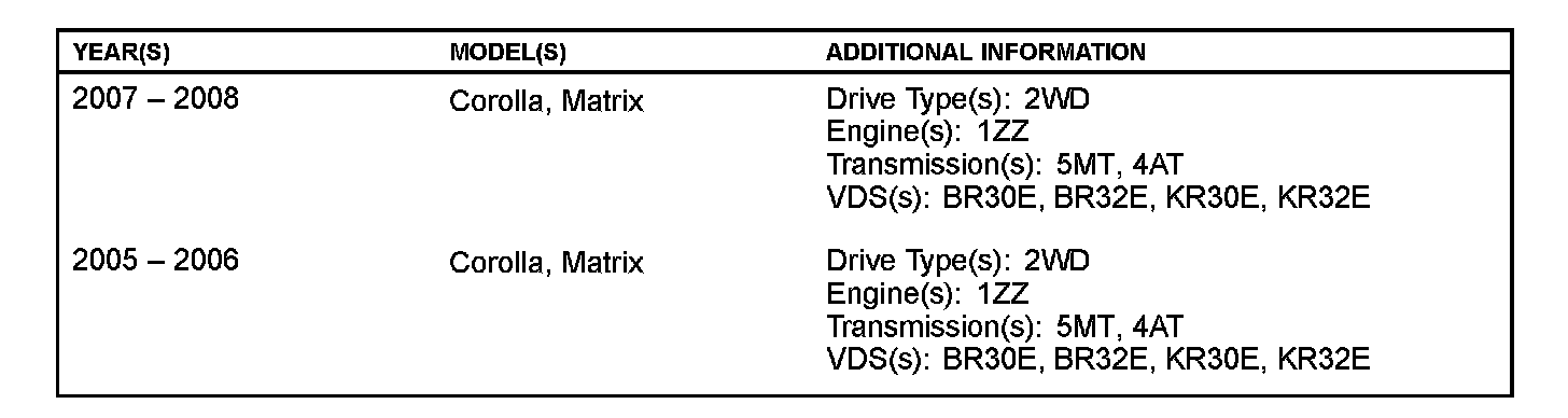 This TSB applies to 2005 - 2006 MY Corolla and Matrix vehicles that are currently equipped with a 2007 MY ECM.