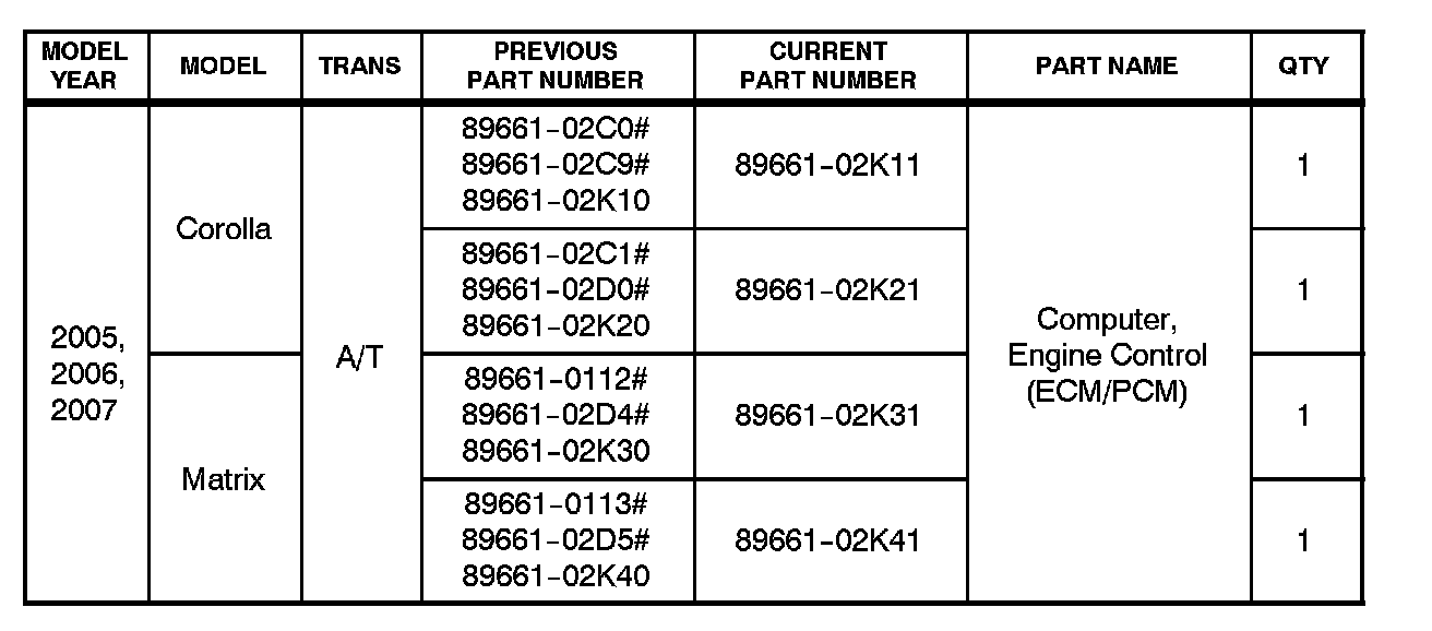 ^ 2005 model year Corolla or Matrix Repair Manual, Engine/Hybrid System - Engine Control - "1ZZ-FE 2ZZ-GE: ECM: Replacement"