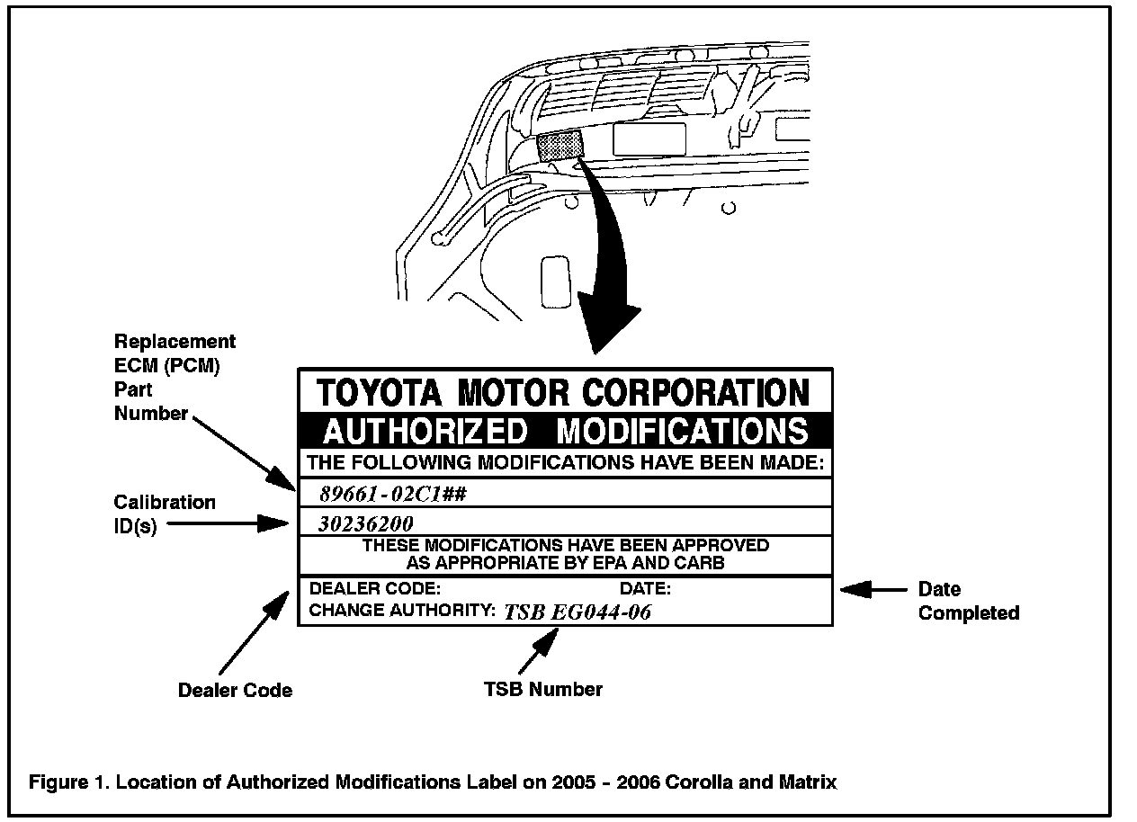 1. Check for the Authorized Modifications Label affixed to the vehicle in the location shown in Figure 1. Confirm if ECM (PCM) calibration has been updated. If NOT the latest ECM (PCM) calibration go to step 2.