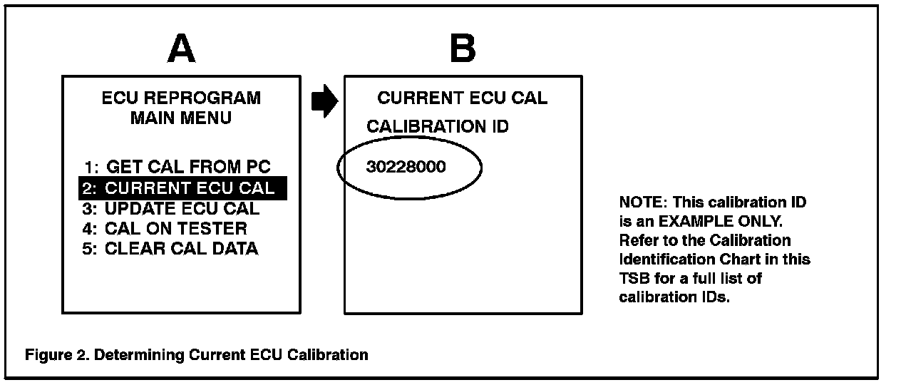 2. Connect the Diagnostic Tester to the vehicle and select CURRENT ECU CAL from the ECU REPROGRAM MAIN MENU. Determine the vehicle's current ECU calibration (see Figure 2).