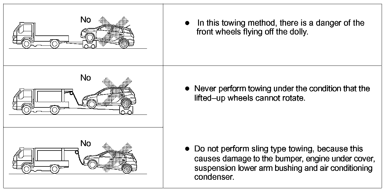 - For example, the towing methods shown are dangerous or damage the vehicle, and therefore do not use them.